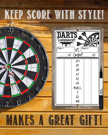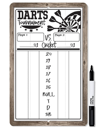 We reinvented the Dart Scoreboard. Our bold designs are printed on a permanent metal Dry-Erase board. It comes with a magnetic marker and a built-in Eraser. The perfect Dart Scoreboard for your Gameroom, Basement or Garage.