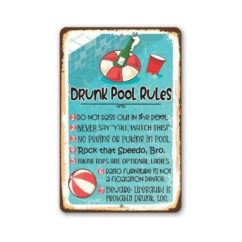 This is a beautiful metal sign that will make the swimmers aware of drunk pool rules. It is an aluminum sign that can be put up inside or outside. For easy mounting on the wall, we make it with two screw holes. Moreover, it is light enough to be mounted with double-sided foam tape or command strips.