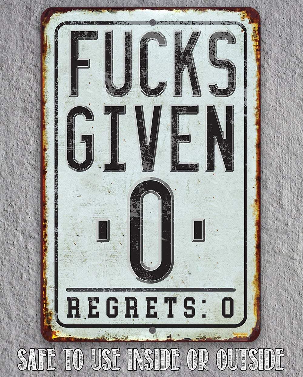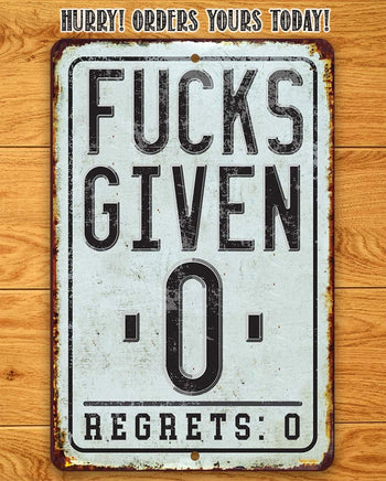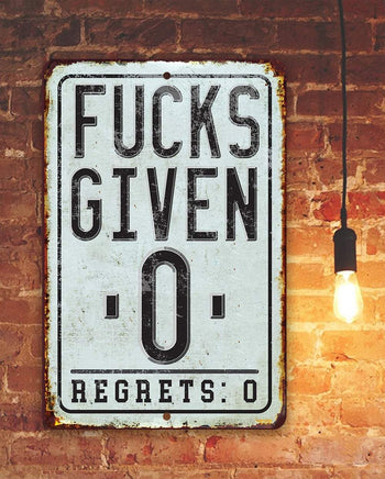 Tin - Fucks Given Zero Regrets Zero - Metal Sign- 8"x12" or 12"x18" Indoor/Outdoor - Funny Decor and Gift