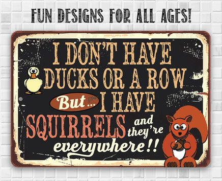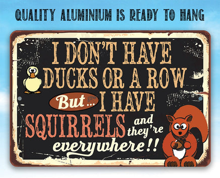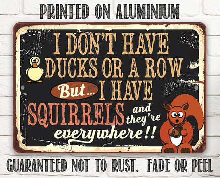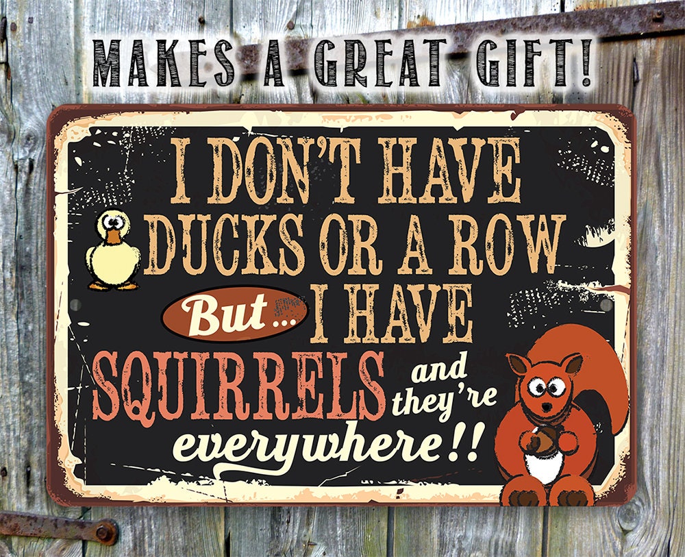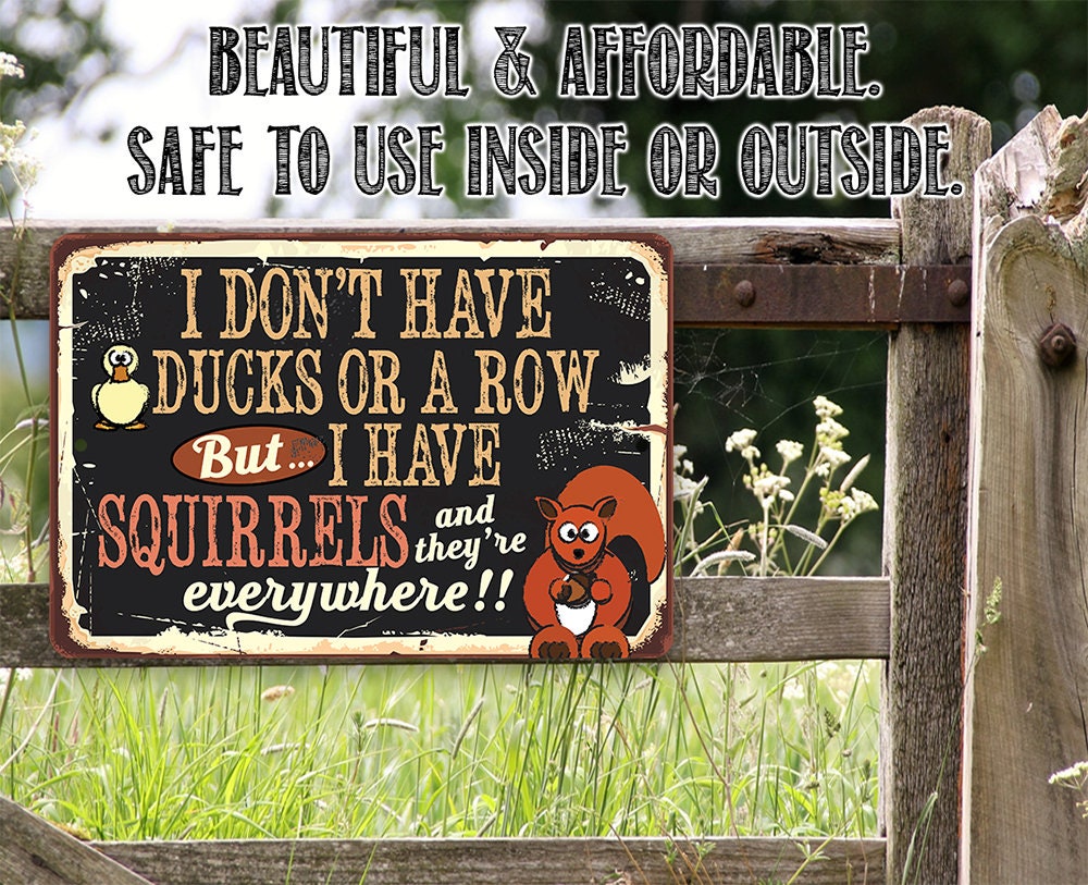 Metal Sign - I Don't Have Ducks or a Row But I Have Squirrels - Durable Metal Sign - Use Indoor/Outdoor - Great Funny Outdoor Yard Decor and Housewarming Gift