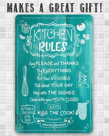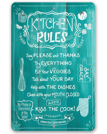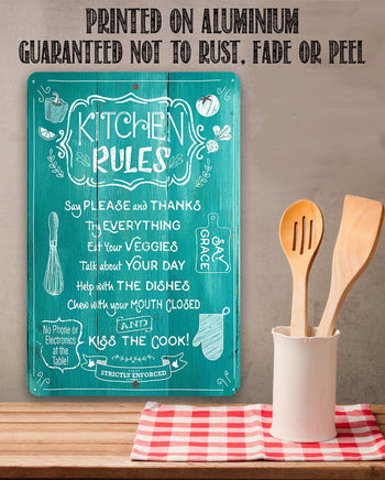 Metal Sign-Kitchen Rules-Durable Metal Sign- 8" x 12" or 12" x 18" Use Indoor/Outdoor-Housewarming Gift The Perfect Gift - A truly unique gift guaranteed to bring a smile Durable - 8" x 12" or 12" x 18" Aluminum metal sign printed with epoxy ink so you can hang it inside or outside Easy to Hang - Comes with two screw holes and it's light enough to be mounted with double-sided foam tape or Command Strips. Guarantee - I´m so sure you´re going to love the sign. Made in the USA (Tomball, Texas) in our family-owned shop