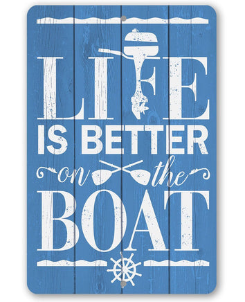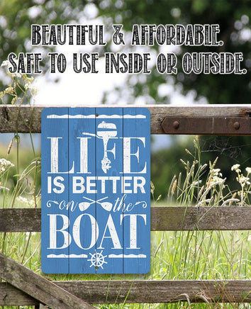 Metal Sign -Life Is Better On The Boat -(Not Printed on Wood) - 8" x 12" or 12" x 18" - Use Indoor/Outdoor - Decor for Cabin and Lake House. The Perfect Gift - A truly unique gift guaranteed to bring a smile Durable - 8" x 12" or 12" x 18" Aluminum metal sign printed with epoxy ink so you can hang it inside or outside Easy to Hang - Comes with two screw holes and it's light enough to be mounted with double-sided foam tape or Command Strips. Guarantee - I´m so sure you´re going to love the sign. Made in the USA (Tomball, Texas) in our family-owned shop