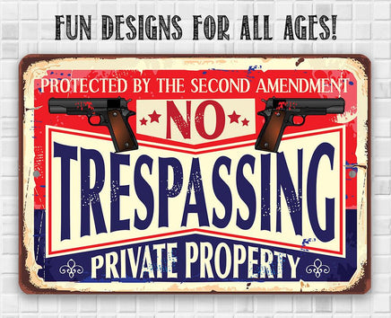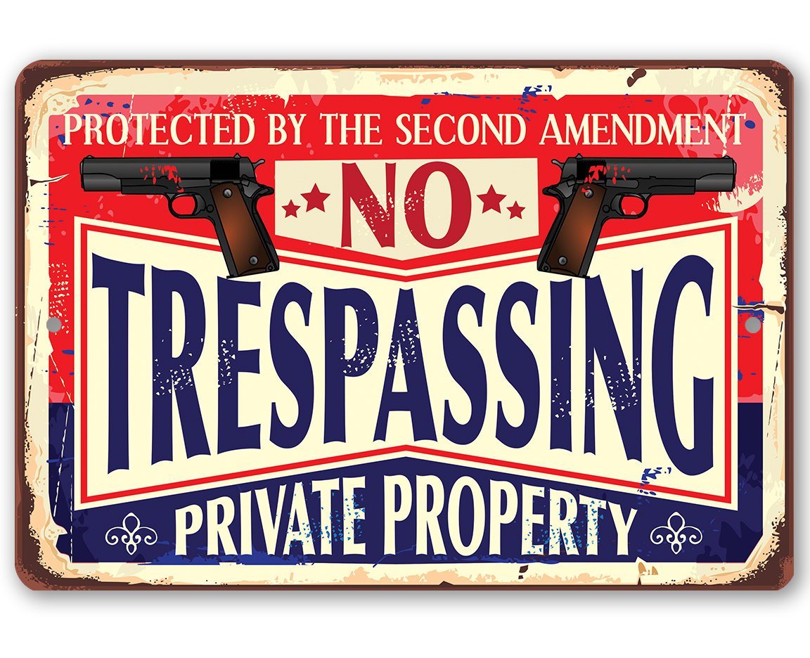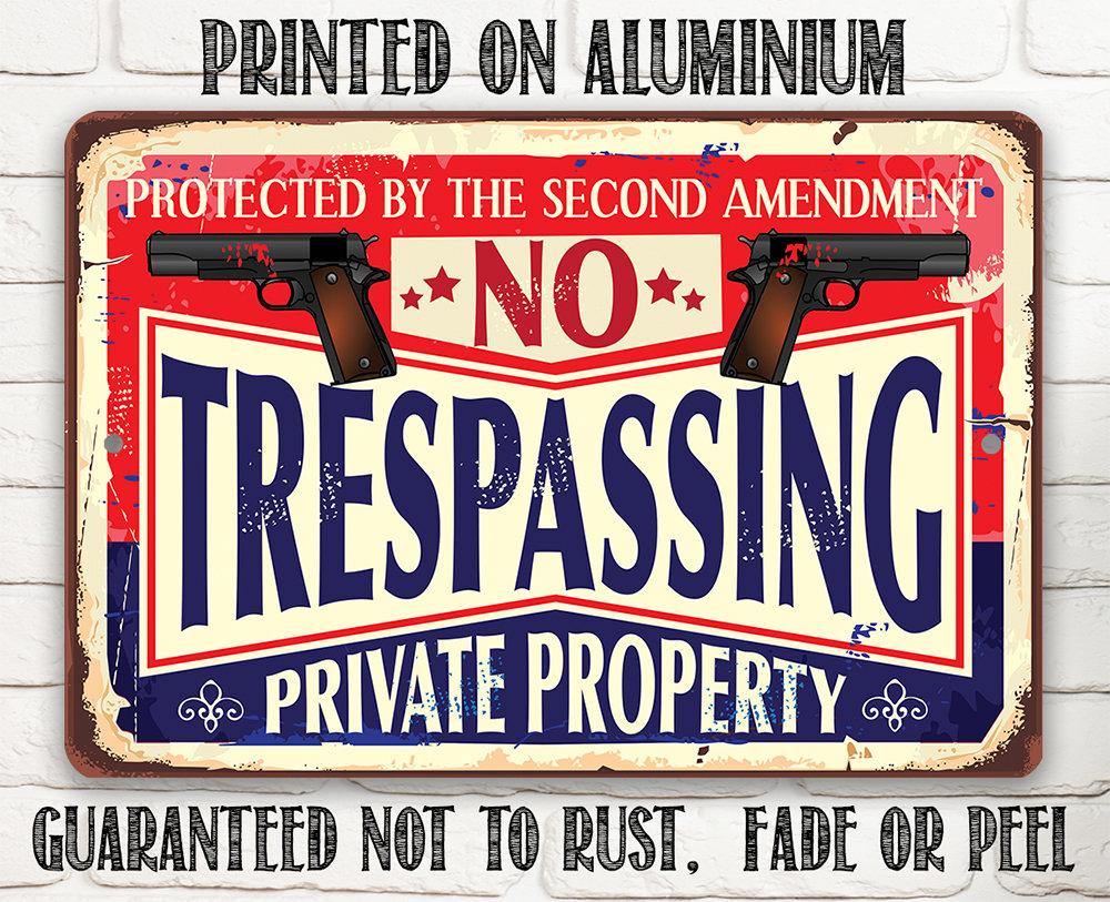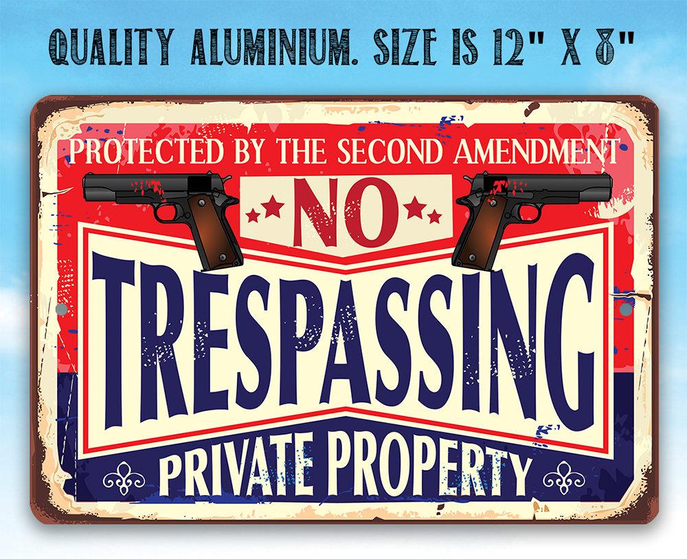 Metal Sign-No Trespassing Protected by the 2nd Amendment Private Property - Durable Metal Sign - 8" x 12" or 12" x 18" Use Indoor/Outdoor - Great Gift and Decor for Fence and Home