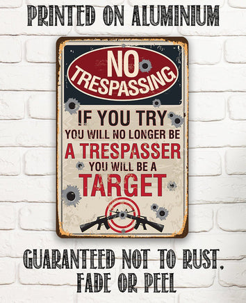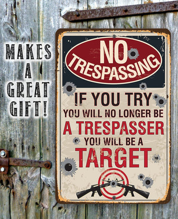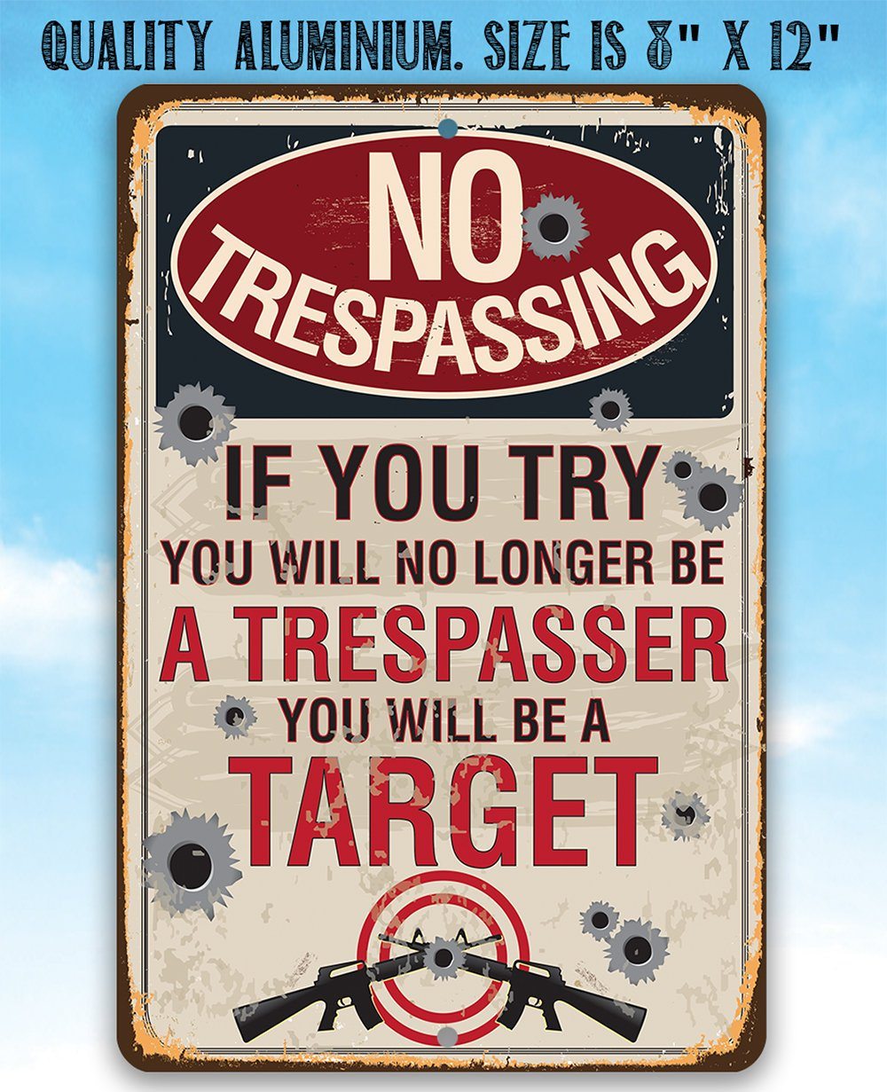 Metal Sign - No Trespassing If You Try - Durable Metal Sign - 8" x 12" or 12" x 18" Use Indoor/Outdoor - Makes a Great Sign to Private Property for Gun Enthusiasts