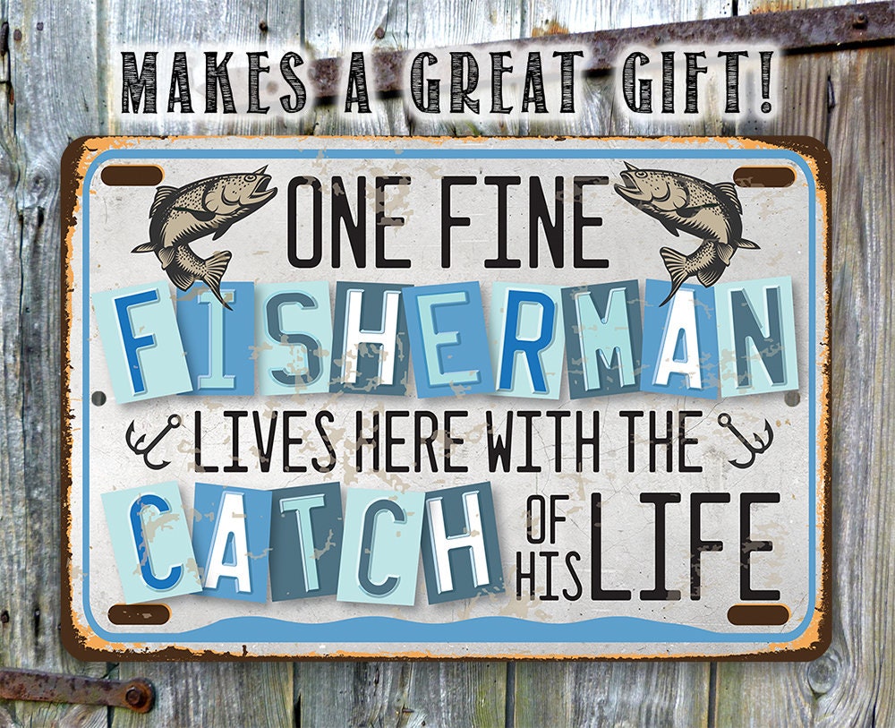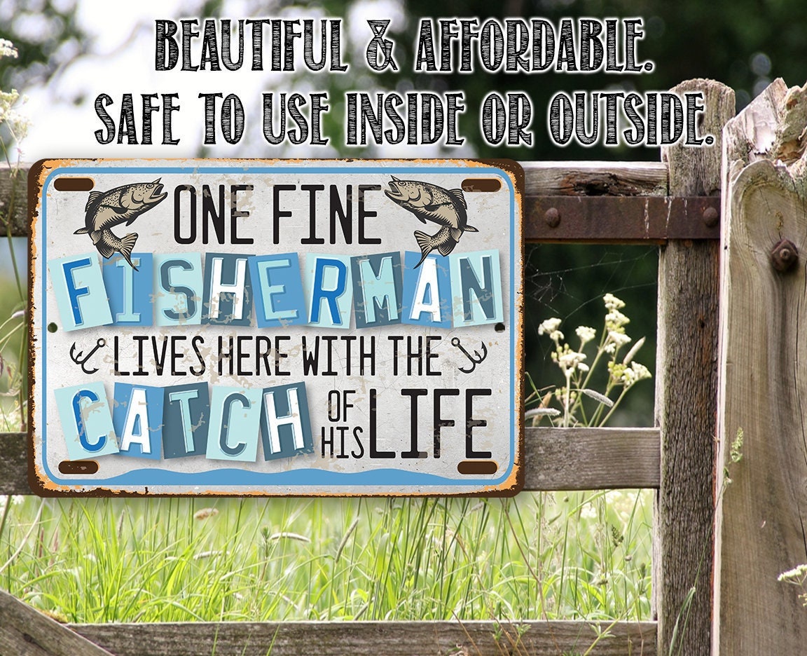 One Fine Fisherman Lives Here With the Catch of His Life - 8" x 12" or 12" x 18" Aluminum Tin Awesome Metal Poster