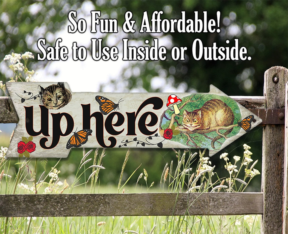 Up Here - Cheshire Cat - Directional Arrow - Metal Sign