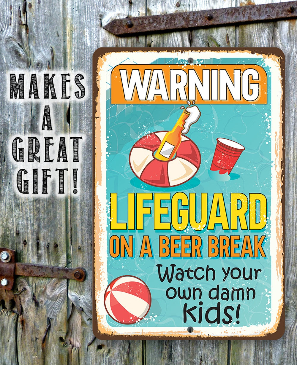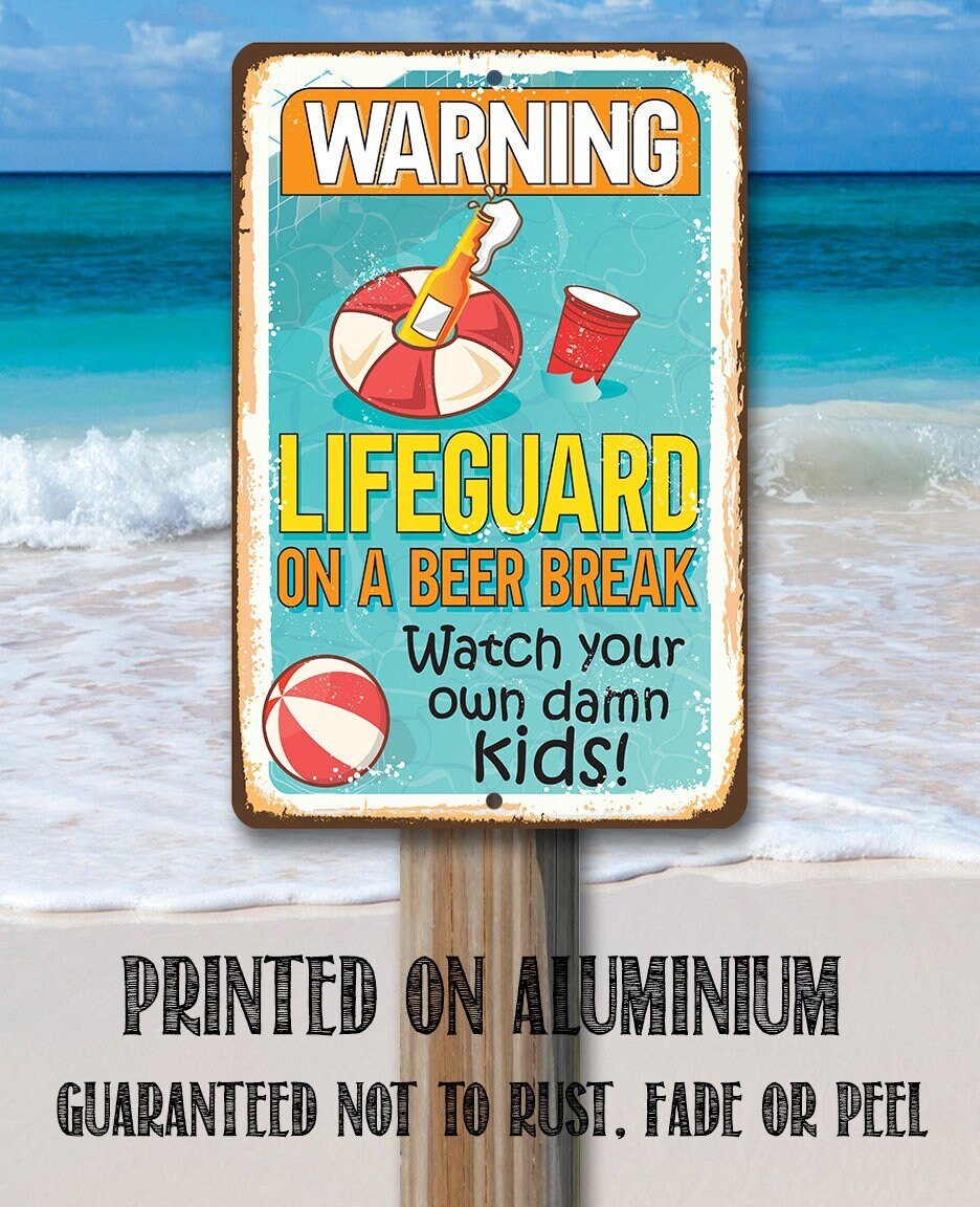 Warning Lifeguard On A Beer Break, Watch Your Own Kids - 8" x 12" or 12" x 18" Aluminum Tin Awesome Metal Poster