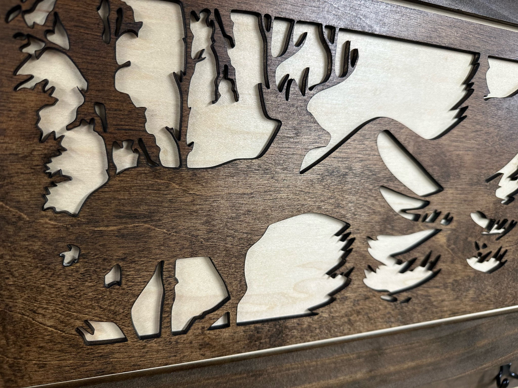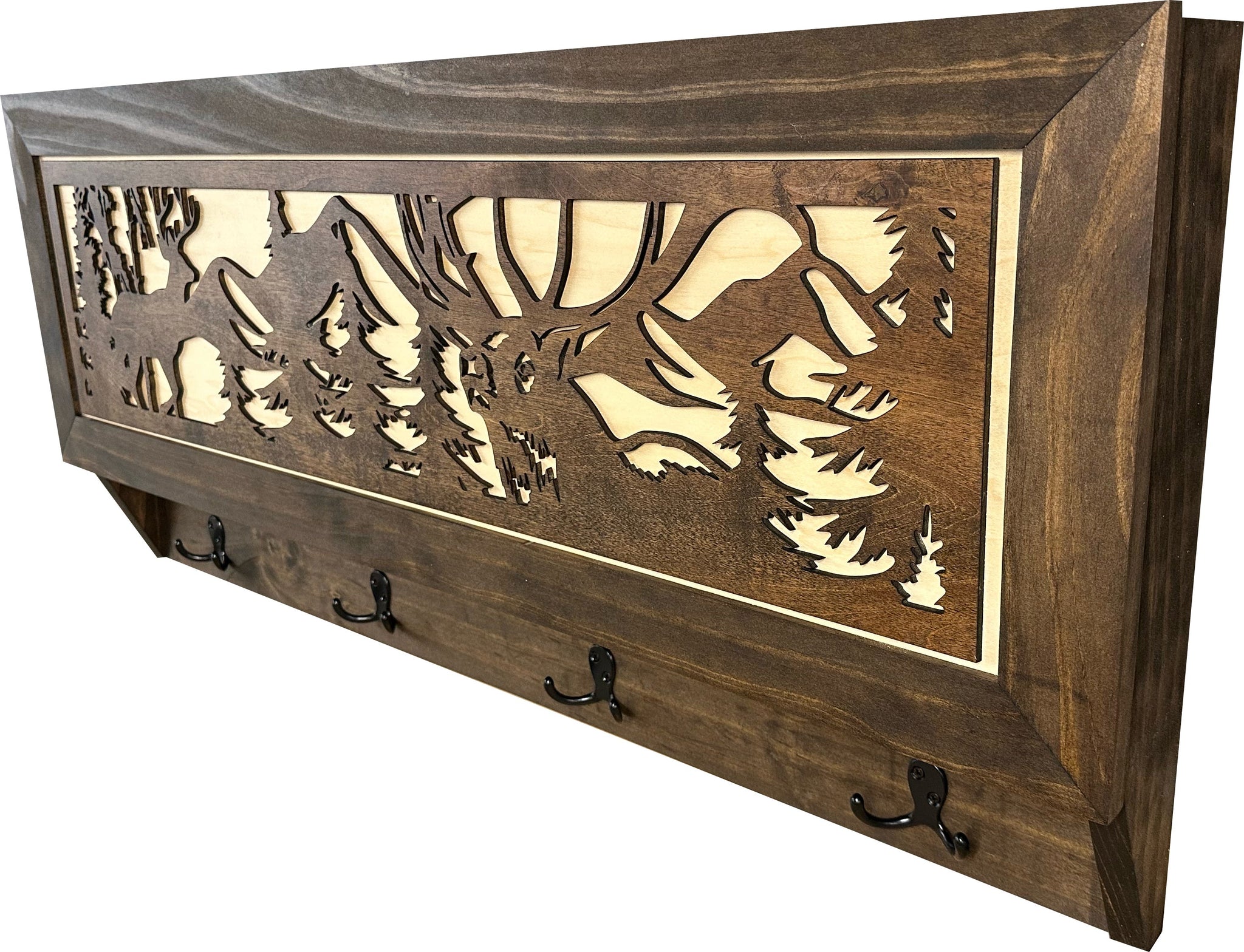 The Bellewood Designs Coat Rack Hidden Gun Storage Deer Hunting In The Woods is the perfect blend of beautiful home decor and functionality. Our hidden gun coat racks are handmade in the U.S.A. featuring unique designs that blend in with your home decor. Not only will they be a focal point in your home they are functional coat racks and no one will ever know your guns and other personal protection is securely store inside! The magnetic lock allows for quick access, while the customizable foam ensures a perfect fit for your firearms. With dimensions of 38"x16"x4", it is a discreet and functional addition to any space.