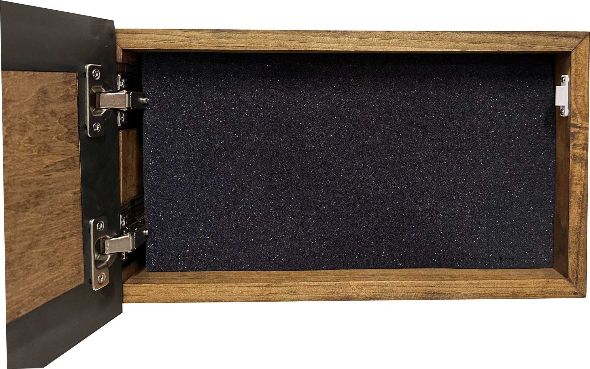 - Wall-Mounted Secured Gun Safe with black frame and english chestnut inset and box with engraved and hand-painted "Faith Over Fear" design.