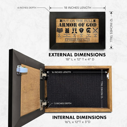 This hidden gun safe is hand-carved in the USA with lasting durability and family-owned care. Featuring the Full Armor of God design with Ephesians 6:10, it serves as hidden gun storage wall decor that blends faith, artistry, and secure protection.