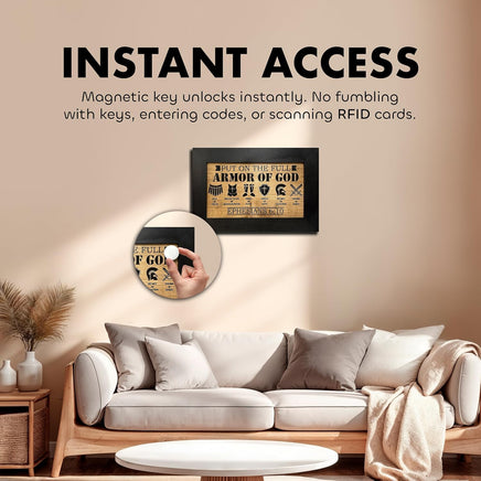 Access your firearm instantly with this wall gun safe. No fumbling with keys, codes, or RFID scanners. Concealment furniture for guns that keeps protection secure, accessible, and ready when every second counts.