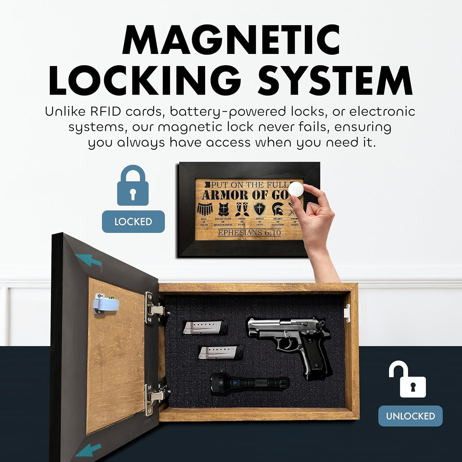 This hidden gun shelf uses a magnetic key system that never fails when needed most. Unlike battery, biometric, or RFID locks, it delivers gun hidden storage with secure and reliable access every time, without the risk of tech failure.