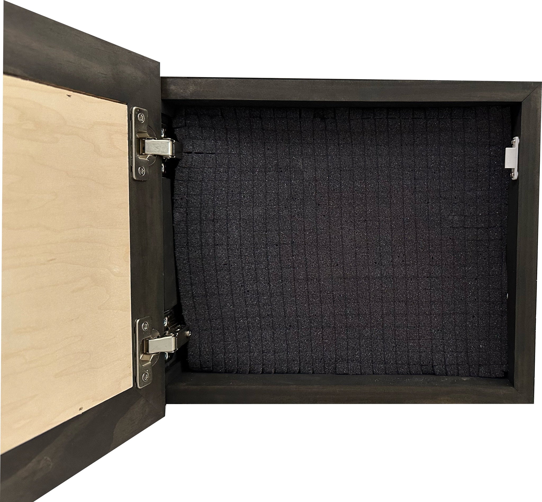 The Black and White Farmhouse Chicken and Eggs Recessed Decorative Hidden Gun cabinet is a secure in-wall gun safe, complete with a magnetic lock and customizable foam insert that is easily modified to hold your gun and other self defense gear. This decorative wall art is finished in black stain with a white front and and a farmhouse chicken and eggs hand-painted design. Our advanced hidden gun safe design ensures your gun is safely and securely stored, providing peace of mind for gun owners. Being recessed in the wall, no one will ever know it's there. This cabinet can also be mounted on the wall for easier installation.