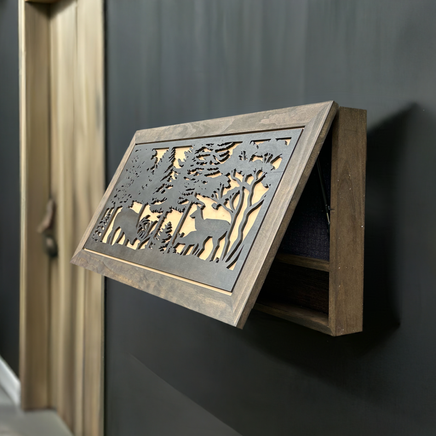 Securely store your gun and other home self defense gear inside the Bellewood Designs Large Hidden Gun Storage Cabinet Deer Scene Wall Decor - Deer In The Woods. Your firearm and other tactical gear is easily accessible yet securely stored, so you'll never have to worry about leaving it unattended. Once you apply the key the lock immediately disengages and you're ready for self defense. This cabinet features a beautiful deep brown frame, natural maple background and eye-catching black 3D deer in the woods scene. The cabinet will be a focal point of any room and no one will ever know what's inside!