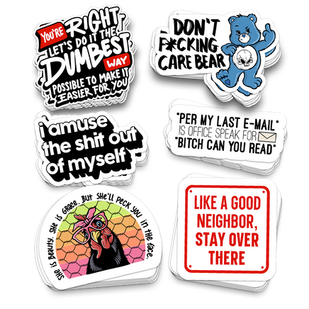 Snarky Packs by Sticker Fire are a preselected bundle of 6 high-quality, super sarcastic adult related vinyl stickers perfect for laptops and water bottles. Save over 50% while adding humor to your daily essentials or sharing laughs with friends.  Each sticker is approximately 2.5-3".
