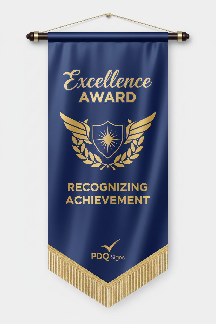 22" x 30" Satin Awards Banners have the highest quality dye sublimation paper transfer print. Banners can be sewn with a wood dowel top and/or bottom, straight or V cut bottom, and with or without fringe. Other options include decorative balls, spear tips, or metal eye hooks for hanging. Material options are Satin or Polyester Poplin (cotton look and feel). Uses include conferences, banquets, ceremonies, awards, and motivational.
