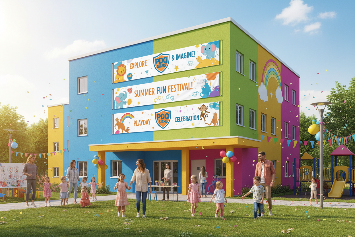 Image of horizontal banners hanging on outside wall of daycare event fun and happy with pdq signs logo