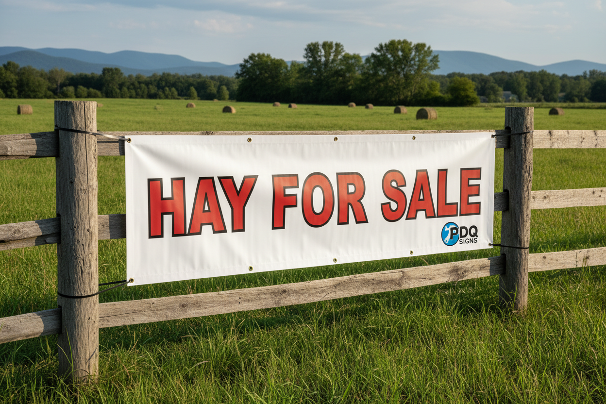 2ft by 8 ft banner horizontal hanging on fence pasture background image HAY FOR SALE pdq signs logo