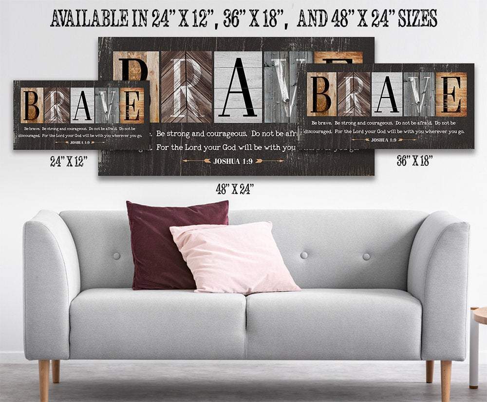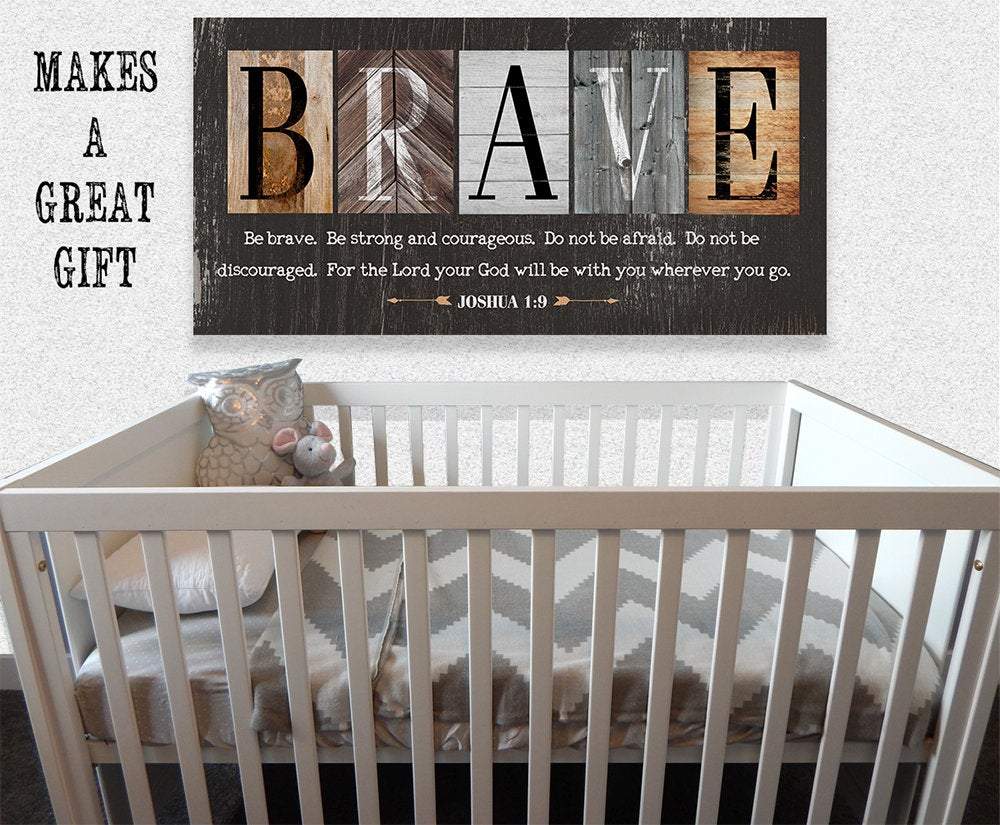 Be Brave Be Strong - Large Canvas Wall Art(Not Printed on Wood)-Stretched on a Heavy Wood Frame-Ready to Hang-Children's Room Decor and GiftUPDATED DESIGNS - We created this design to be on trend with an elegant, timeless style that will greatly complement your homeMADE IN AMERICA - All our canvas artwork is hand-stretched by our employees in Tomball, Texas. We take pride in doing the work here and doing it right.REAL WOOD - We only use real pine 1.5" stretcher bars. We never use cheap particleboard stretcher bars like other sellers.PREMIUM CANVAS - So much of what goes into the final reproduction depends on the quality and consistency of the canvas. We only use acid-free, heavy canvas, which is not only durable but will not degrade over time. The surface has been specially prepared to accept and hold the inks, allowing them to radiate the brilliant color.PREMIUM INKS - The canvas is printed one at a time with the finest UV resistant inks using the latest high-resolution giclee printers. As the ink is laid on the matched and coated canvas, the result is an absolutely opaque, rich and brilliant reproduction. In addition, the UV properties of the ink ensure a fade-resistant, long-lasting beautiful image for decades.HAND STRETCHED - To ensure that the canvas remains taught, it is hand stretched around hardwood stretcher bars, fixed using no less than one staple per two inches.THE ART - Now that you know how much effort goes into each piece, it’s time to do the most important step…selecting your favorite image... Click the Select Options button to start your order