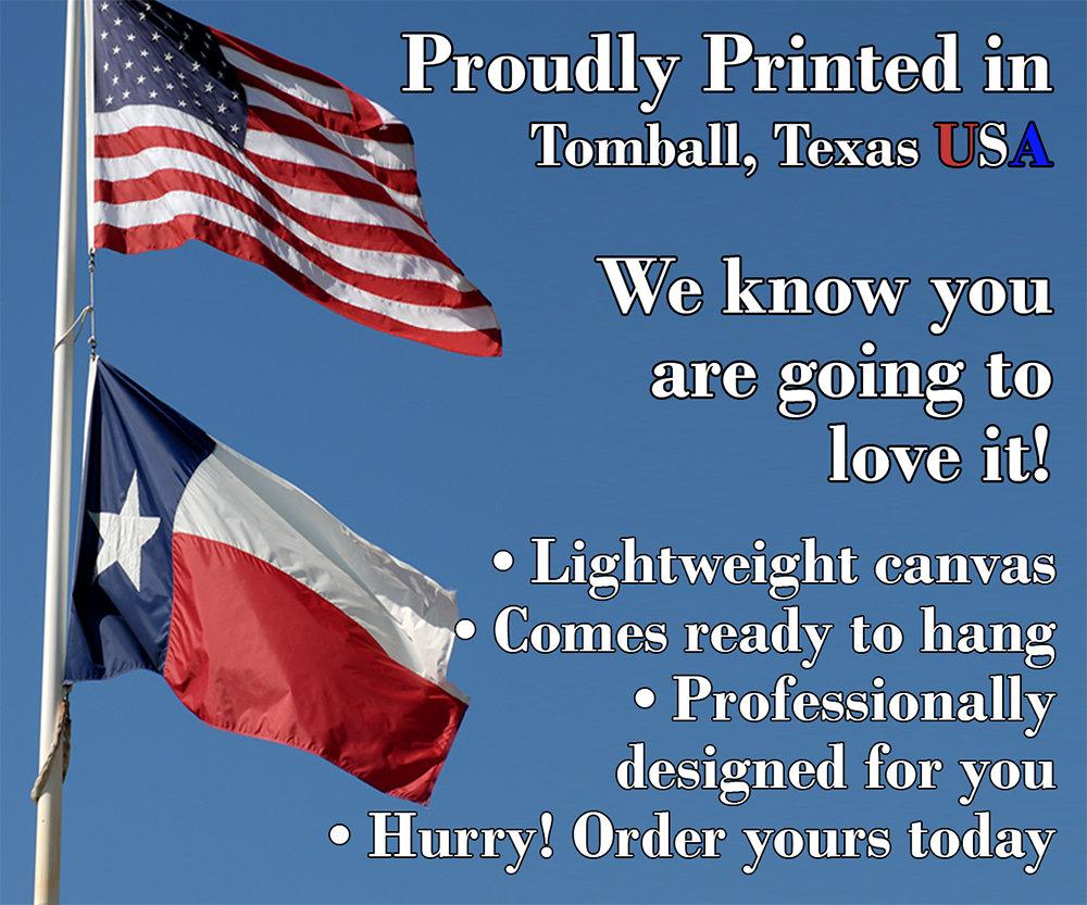 MADE IN AMERICA - All our canvas artwork is hand-stretched by our employees in Tomball, Texas. We take pride in doing the work here and doing it right.
