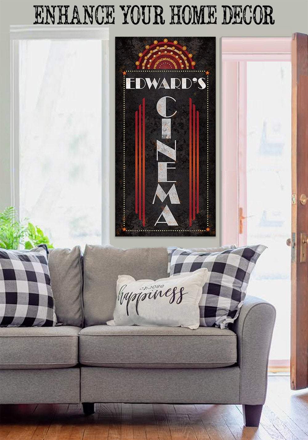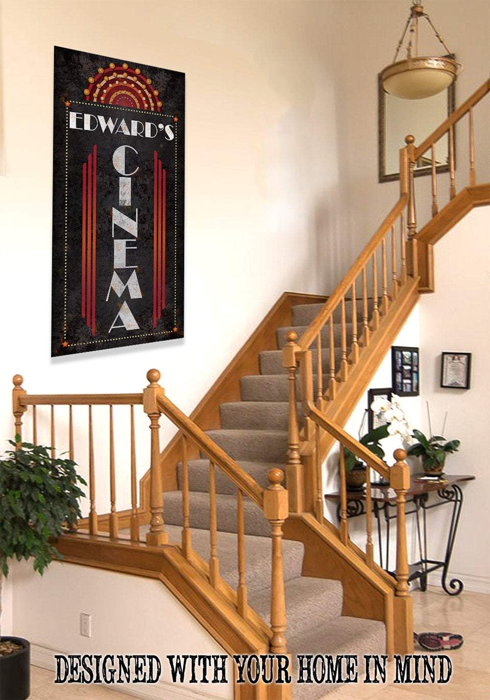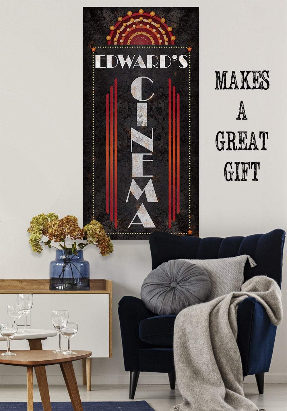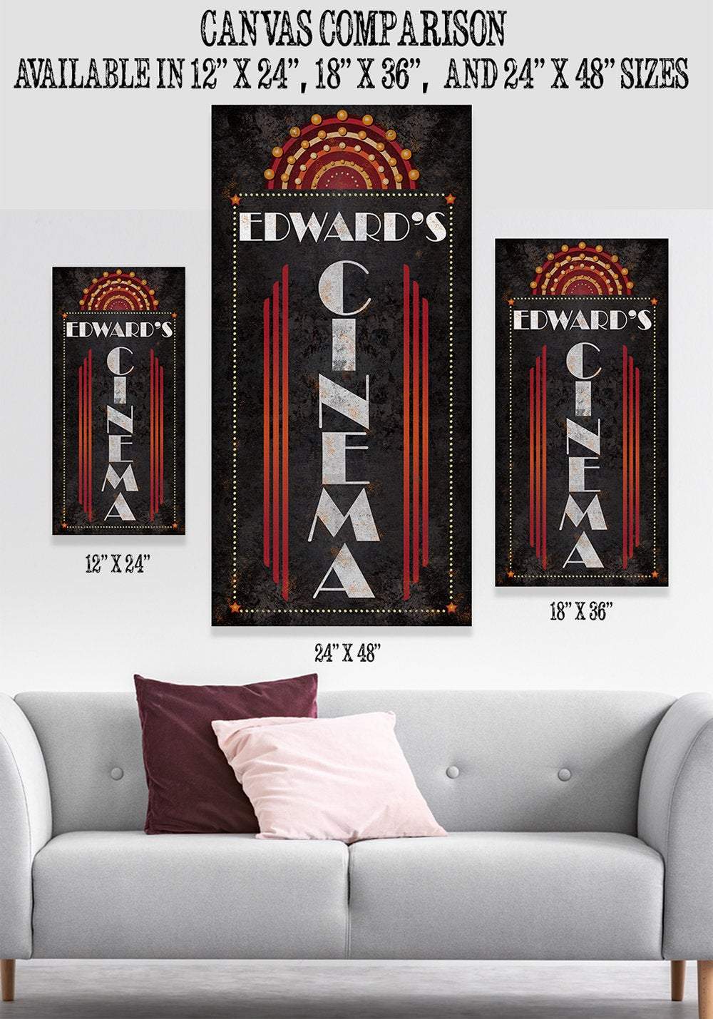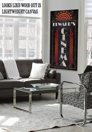 Personalized - Cinema Vertical - Large Canvas Wall Art (Not Printed on Metal) - Stretched on a Wood Frame - Home Theater and Entertainment Decor - Makes a Great Housewarming GiftBring an elegant touch to any room! This large, vivid colored artwork adds the perfect focal point to any room.UPDATED DESIGNS - We created this design to be on trend with an elegant, timeless style that will greatly complement your homeMADE IN AMERICA - All our canvas artwork is hand-stretched by our employees in Tomball, Texas. We take pride in doing the work here and doing it right.REAL WOOD - We only use real pine 1.5" stretcher bars. We never use cheap particleboard stretcher bars like other sellers.PREMIUM CANVAS - So much of what goes into the final reproduction depends on the quality and consistency of the canvas. We only use acid-free, heavy canvas, which is not only durable but will not degrade over time. The surface has been specially prepared to accept and hold the inks, allowing them to radiate the brilliant color.PREMIUM INKS - The canvas is printed one at a time with the finest UV resistant inks using the latest high-resolution giclee printers. As the ink is laid on the matched and coated canvas, the result is an absolutely opaque, rich and brilliant reproduction. In addition, the UV properties of the ink ensure a fade-resistant, long-lasting beautiful image for decades.HAND STRETCHED - To ensure that the canvas remains taught, it is hand stretched around hardwood stretcher bars, fixed using no less than one staple per inch.THE ART - Now that you know how much effort goes into each piece, itâs time to do the most important stepâ¦selecting your favorite image... Click the Select Options button to start your order