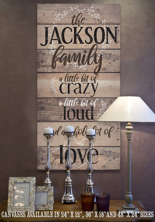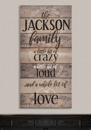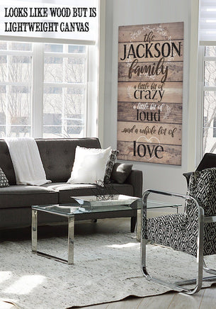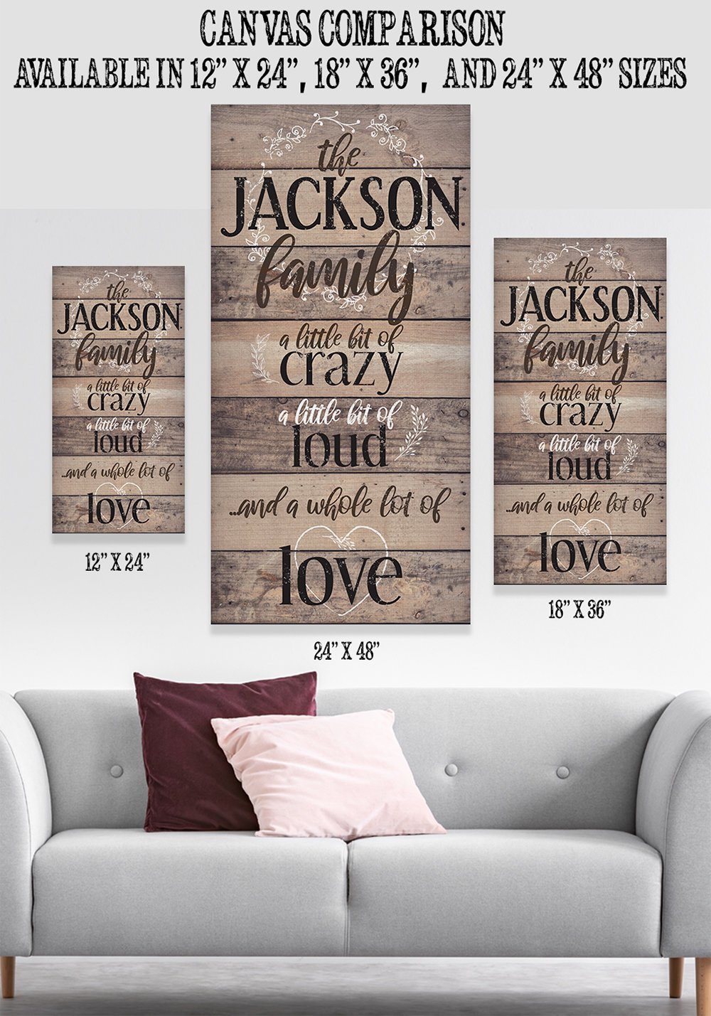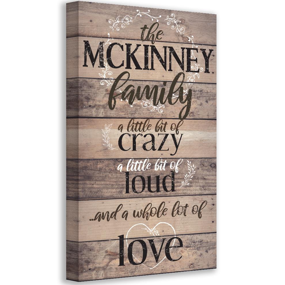Personalized - Family A Little Bit Of Crazy Large Canvas Wall Art (Not Printed on Wood) - Stretched on a Heavy Wood Frame - Perfect Above a Couch & Living Room Decor or Housewarming GiftBring an elegant touch to any room! This large, vivid colored artwork adds the perfect focal point to any room.UPDATED DESIGNS - We created this design to be on trend with an elegant, timeless style that will greatly complement your homeMADE IN AMERICA - All our canvas artwork is hand-stretched by our employees in Tomball, Texas. We take pride in doing the work here and doing it right.REAL WOOD - We only use real pine 1.5" stretcher bars. We never use cheap particleboard stretcher bars like other sellers.PREMIUM CANVAS - So much of what goes into the final reproduction depends on the quality and consistency of the canvas. We only use acid-free, heavy canvas, which is not only durable but will not degrade over time. The surface has been specially prepared to accept and hold the inks, allowing them to radiate the brilliant color.PREMIUM INKS - The canvas is printed one at a time with the finest UV resistant inks using the latest high-resolution giclee printers. As the ink is laid on the matched and coated canvas, the result is an absolutely opaque, rich and brilliant reproduction. In addition, the UV properties of the ink ensure a fade-resistant, long-lasting beautiful image for decades.HAND STRETCHED - To ensure that the canvas remains taught, it is hand stretched around hardwood stretcher bars, fixed using no less than one staple per inch.THE ART - Now that you know how much effort goes into each piece, itâs time to do the most important stepâ¦selecting your favorite image... Click the Select Options button to start your order