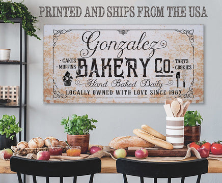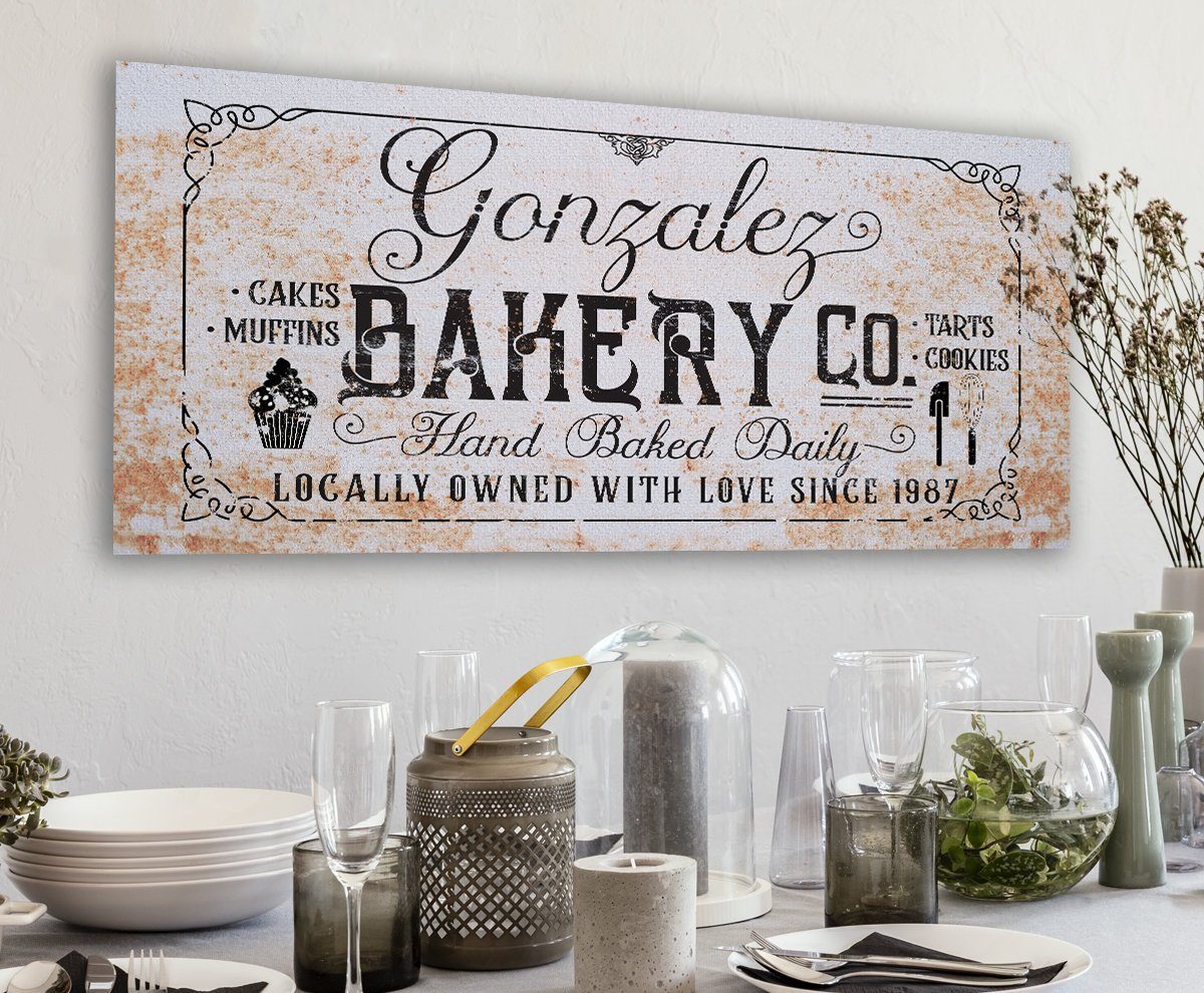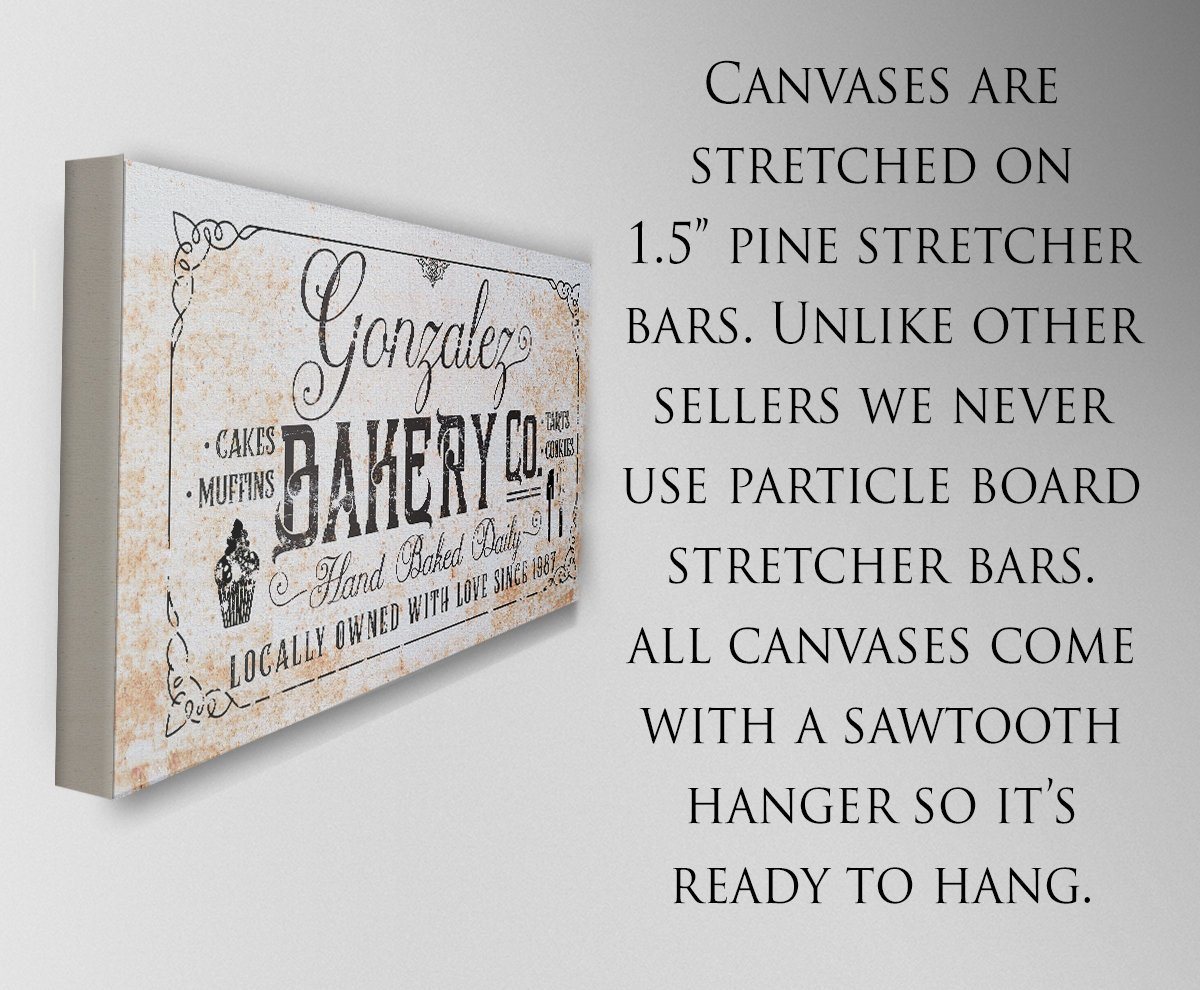Personalized-Family Name Bakery-Large Canvas Wall Art (Not Printed on Metal)-Stretched on a Heavy Wood-Bake Shop Decor-Gift to Bakery OwnersBring an elegant touch to any room! This large, vivid colored artwork adds the perfect focal point to any room.UPDATED DESIGNS - We created this design to be on trend with an elegant, timeless style that will greatly complement your homeMADE IN AMERICA - All our canvas artwork is hand-stretched by our employees in Tomball, Texas. We take pride in doing the work here and doing it right.REAL WOOD - We only use real pine 1.5" stretcher bars. We never use cheap particleboard stretcher bars like other sellers.PREMIUM CANVAS - So much of what goes into the final reproduction depends on the quality and consistency of the canvas. We only use acid-free, heavy canvas, which is not only durable but will not degrade over time. The surface has been specially prepared to accept and hold the inks, allowing them to radiate the brilliant color.PREMIUM INKS - The canvas is printed one at a time with the finest UV resistant inks using the latest high-resolution giclee printers. As the ink is laid on the matched and coated canvas, the result is an absolutely opaque, rich and brilliant reproduction. In addition, the UV properties of the ink ensure a fade-resistant, long-lasting beautiful image for decades.HAND STRETCHED - To ensure that the canvas remains taught, it is hand stretched around hardwood stretcher bars, fixed using no less than one staple per inch.THE ART - Now that you know how much effort goes into each piece, itâs time to do the most important stepâ¦selecting your favorite image... Click the Select Options button to start your order