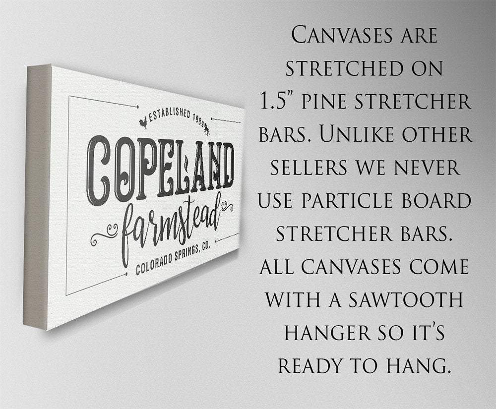 Personalized - Family Name Farmstead - Large Black and White Canvas Wall Art - Stretched on a Heavy Wood Frame - Perfect Above a Couch or Headboard Farm House Decor - Housewarming GiftBring an elegant touch to any room! This large, vivid colored artwork adds the perfect focal point to any room.UPDATED DESIGNS - We created this design to be on trend with an elegant, timeless style that will greatly complement your homeMADE IN AMERICA - All our canvas artwork is hand-stretched by our employees in Tomball, Texas. We take pride in doing the work here and doing it right.REAL WOOD - We only use real pine 1.5" stretcher bars. We never use cheap particleboard stretcher bars like other sellers.PREMIUM CANVAS - So much of what goes into the final reproduction depends on the quality and consistency of the canvas. We only use acid-free, heavy canvas, which is not only durable but will not degrade over time. The surface has been specially prepared to accept and hold the inks, allowing them to radiate the brilliant color.PREMIUM INKS - The canvas is printed one at a time with the finest UV resistant inks using the latest high-resolution giclee printers. As the ink is laid on the matched and coated canvas, the result is an absolutely opaque, rich and brilliant reproduction. In addition, the UV properties of the ink ensure a fade-resistant, long-lasting beautiful image for decades.HAND STRETCHED - To ensure that the canvas remains taught, it is hand stretched around hardwood stretcher bars, fixed using no less than one staple per inch.THE ART - Now that you know how much effort goes into each piece, itâs time to do the most important stepâ¦selecting your favorite image... Click the Select Options button to start your order