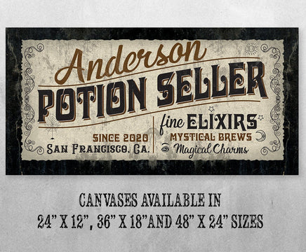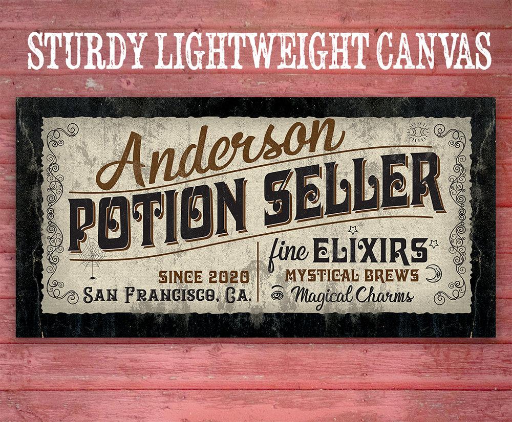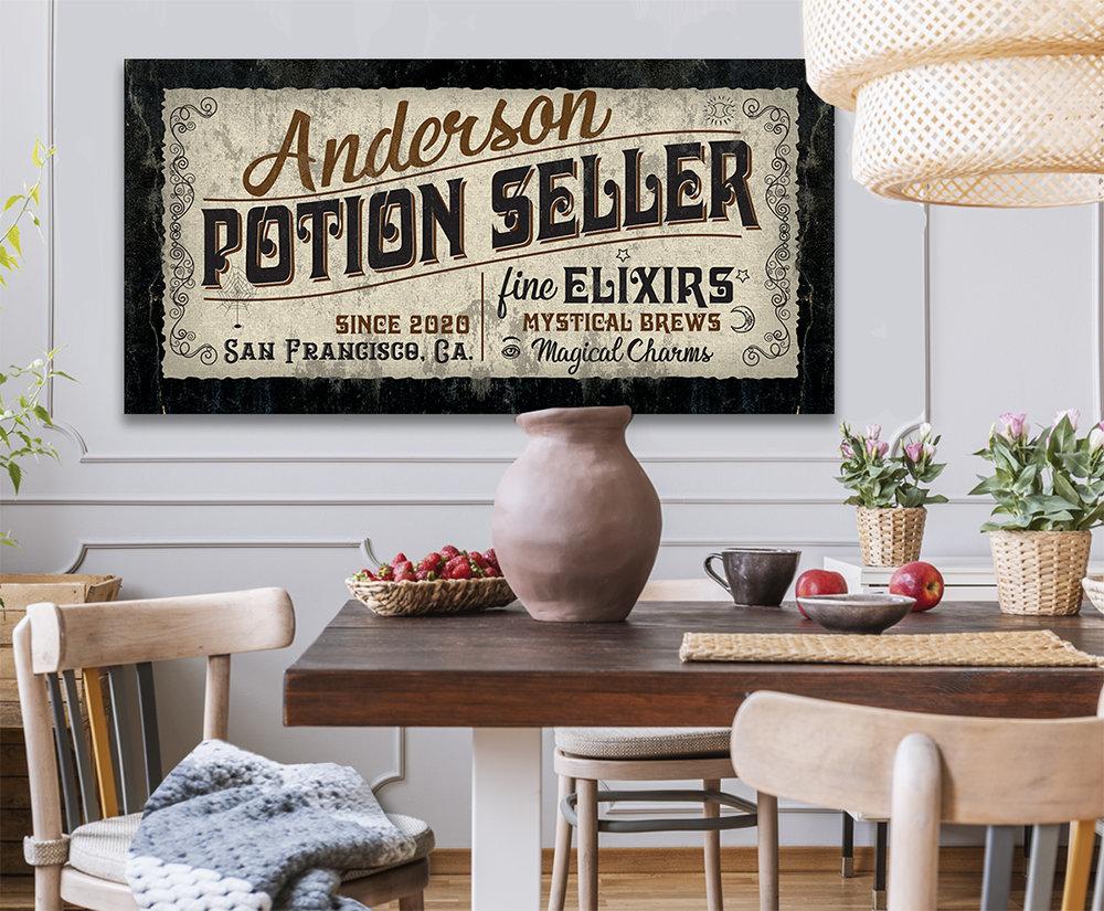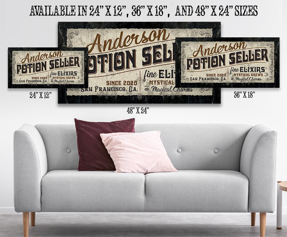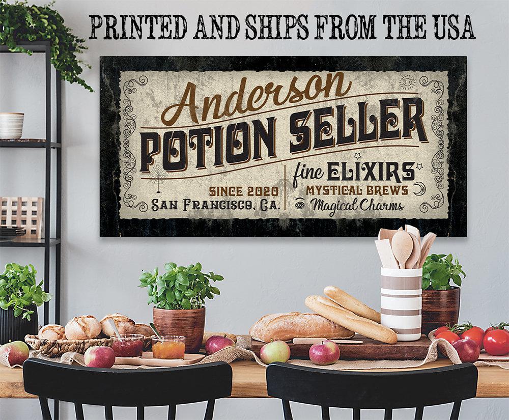 Personalized - Potion Seller - Large Canvas (Not Printed on Metal) - Stretched on Wood-Perfect Personalized Pharmacy Decor-Housewarming GiftBring an elegant touch to any room! This large, vivid colored artwork adds the perfect focal point to any room.UPDATED DESIGNS - We created this design to be on trend with an elegant, timeless style that will greatly complement your homeMADE IN AMERICA - All our canvas artwork is hand-stretched by our employees in Tomball, Texas. We take pride in doing the work here and doing it right.REAL WOOD - We only use real pine 1.5" stretcher bars. We never use cheap particleboard stretcher bars like other sellers.PREMIUM CANVAS - So much of what goes into the final reproduction depends on the quality and consistency of the canvas. We only use acid-free, heavy canvas, which is not only durable but will not degrade over time. The surface has been specially prepared to accept and hold the inks, allowing them to radiate the brilliant color.PREMIUM INKS - The canvas is printed one at a time with the finest UV resistant inks using the latest high-resolution giclee printers. As the ink is laid on the matched and coated canvas, the result is an absolutely opaque, rich and brilliant reproduction. In addition, the UV properties of the ink ensure a fade-resistant, long-lasting beautiful image for decades.HAND STRETCHED - To ensure that the canvas remains taught, it is hand stretched around hardwood stretcher bars, fixed using no less than one staple per inch.THE ART - Now that you know how much effort goes into each piece, itâs time to do the most important stepâ¦selecting your favorite image... Click the Select Options button to start your order