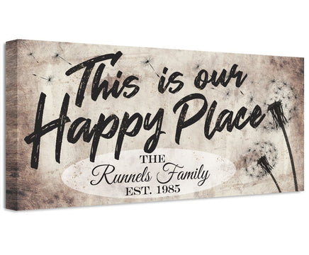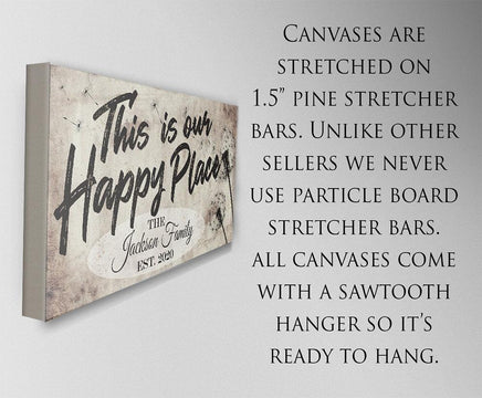 Personalized - This Is Our Happy Place Large Canvas Wall Art - Stretched on a Heavy Wood Frame - Perfect for Above a Couch and Living Room Decor - Makes a Great Housewarming GiftBring an elegant touch to any room! This large, vivid colored artwork adds the perfect focal point to any room.UPDATED DESIGNS - We created this design to be on trend with an elegant, timeless style that will greatly complement your homeMADE IN AMERICA - All our canvas artwork is hand-stretched by our employees in Tomball, Texas. We take pride in doing the work here and doing it right.REAL WOOD - We only use real pine 1.5" stretcher bars. We never use cheap particleboard stretcher bars like other sellers.PREMIUM CANVAS - So much of what goes into the final reproduction depends on the quality and consistency of the canvas. We only use acid-free, heavy canvas, which is not only durable but will not degrade over time. The surface has been specially prepared to accept and hold the inks, allowing them to radiate the brilliant color.PREMIUM INKS - The canvas is printed one at a time with the finest UV resistant inks using the latest high-resolution giclee printers. As the ink is laid on the matched and coated canvas, the result is an absolutely opaque, rich and brilliant reproduction. In addition, the UV properties of the ink ensure a fade-resistant, long-lasting beautiful image for decades.HAND STRETCHED - To ensure that the canvas remains taught, it is hand stretched around hardwood stretcher bars, fixed using no less than one staple per inch.THE ART - Now that you know how much effort goes into each piece, it’s time to do the most important step…selecting your favorite image... Click the Select Options button to start your order