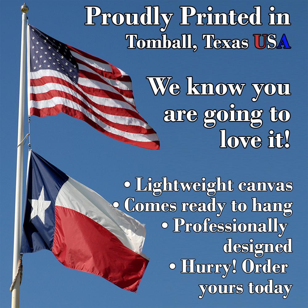 MADE IN AMERICA - All our canvas artwork is hand-stretched by our employees in Tomball, Texas. We take pride in doing the work here and doing it right. REAL WOOD - We only use real pine 1.5" stretcher bars. We never use cheap particleboard stretcher bars like other sellers.