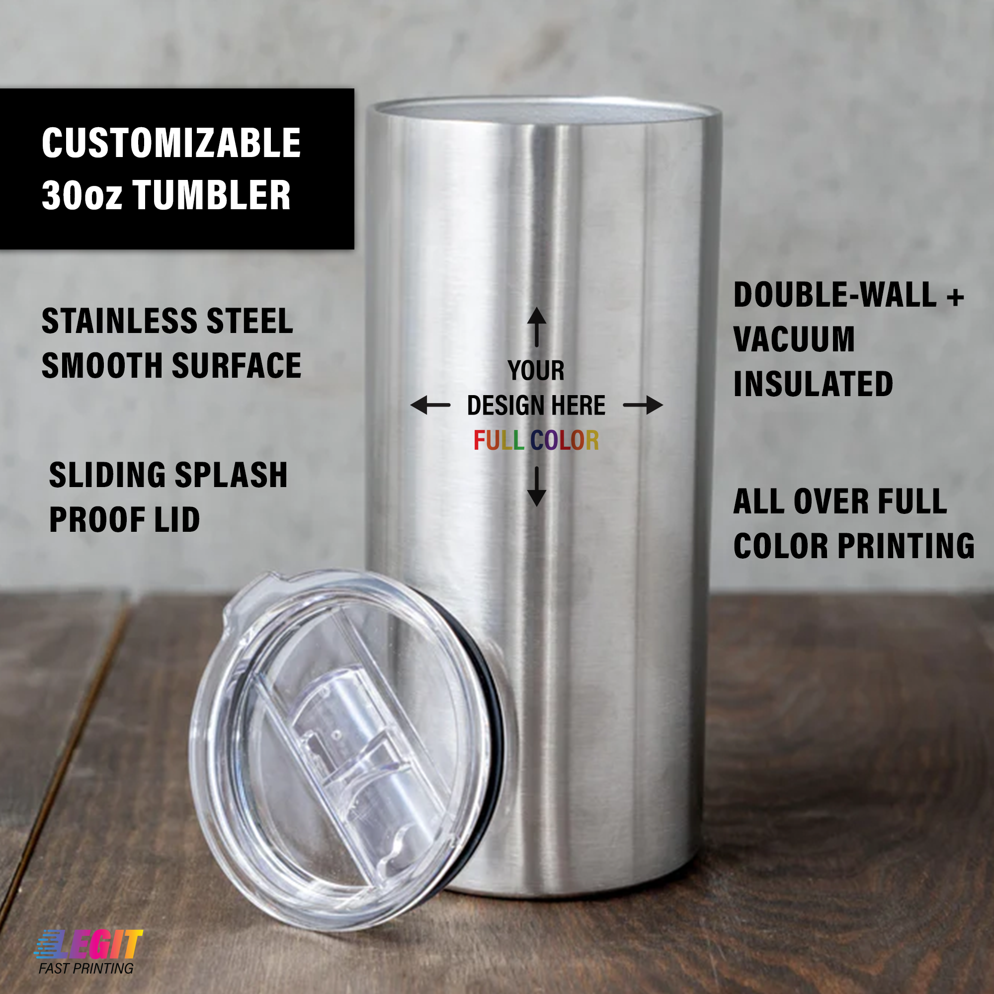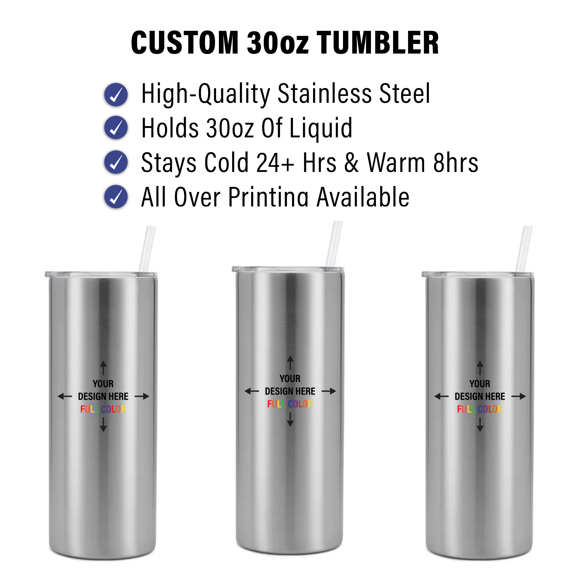 Need a custom gift, a branded promotional item, or just a personalized tumbler of your own? Show off your unique design with this fully customized 30oz tumbler. No matter your design, this personalized tumbler lets you show off your logo, image, text, or complete design wrapping around the entire tumbler. Crafted from smooth stainless steel, our UV rotary Printer can print your custom design all over the tumbler. This stainless steel tumbler is double-walled and vacuum insulated, allowing drinks to stay cold for 24+ hours and warm for up to 8. Measuring 3.32" in diameter and 8.75" tall, this tumbler holds 30oz of liquid, making it ideal for coffee, tea, soda, juice, water, smoothies, milk tea, and more. A straw and sliding splash-proof lid is included with each tumbler ordered. Perfect for a Mother's Day gift, a bridesmaid gift, a gift for your loved one, a promo gift for a client or colleague, or a gift for yourself, this fully customizable, full color, allover printed tumbler allows you to create your very own unique gift. Please note that handwash is recommended, this tumbler is not microwave or dishwasher safe.