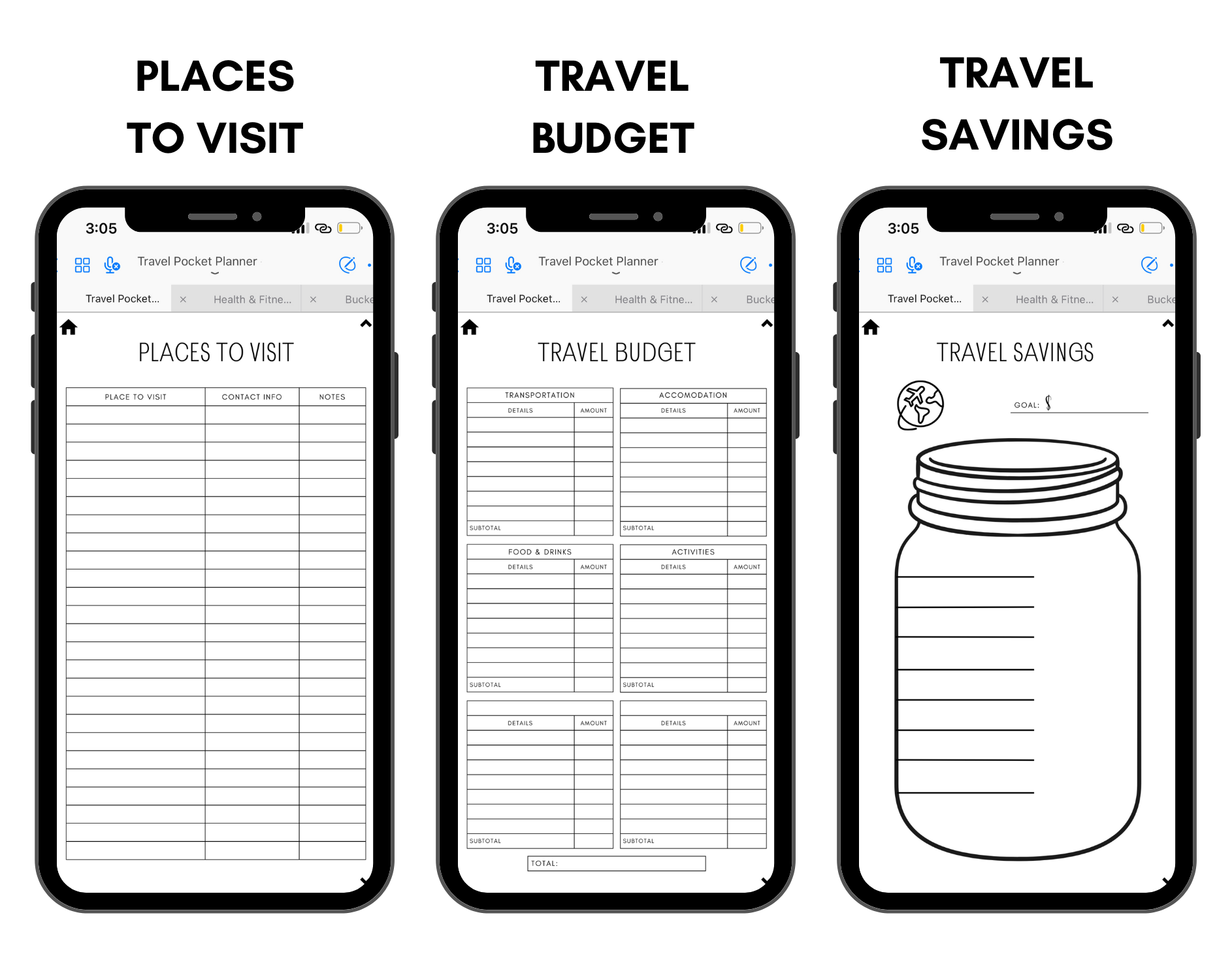 The Travel Pocket Planner is an undated digital phone planner that can be used year after year. It covers all the travel planning basics, making it very functional, simple and easy to use.