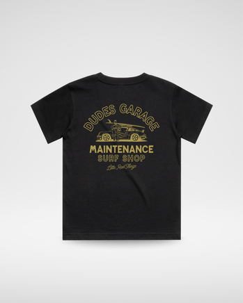 Transform your little dude's style with our Garage vintage tee. This 100% Organic Cotton Black Tee features a striking gold automotive graphic that captures retro garage vibes. Crafted from sustainable cotton for ultimate softness and durability.