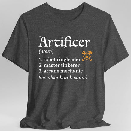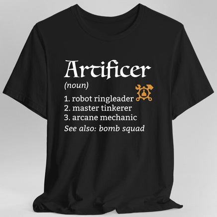 Show off your love for the ingenious artificer class with our witty class definition t-shirt! Perfect for Dungeons & Dragons enthusiasts who appreciate a touch of humor and clever design.