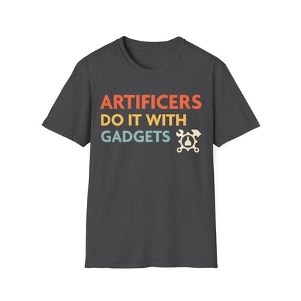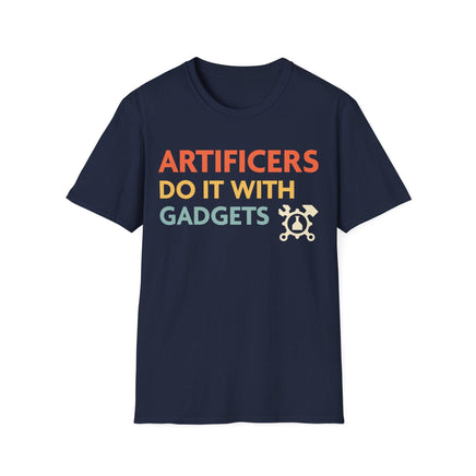 Unleash your inner adventurer with our 'Artificers Do It With Gadgets' t-shirt! Embrace your role, express your style, and let the world know just how your favorite class gets things done in the realm of fantasy! This fun D&D Artificer class shirt is sure to be a hit on game night.