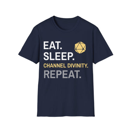 Channel your inner divinity with our 'Eat, Sleep, Channel Divinity, Repeat' T-Shirt. Tailored for the devoted Dungeons & Dragons players who embody the Cleric class, this tee honors the sacred cycle of healing, blessing, and fighting with a divine touch.