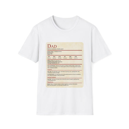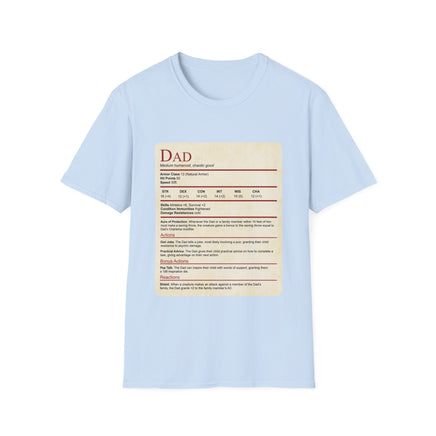 Fathers will love this dnd dad shirt designed for Dungeons & Dragons loving dads: the DnD Dad Shirt! Featuring a funny stat block for the "dad" creature, it makes for the perfect Father's Day or birthday gift for the D&D loving dad in your life. So show your appreciation for all the hard work and love that dads put into their families with our fun and functional "Dad Stat Block" t-shirt!