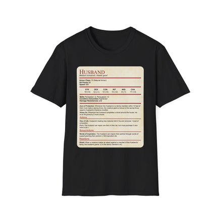 Introducing our latest t-shirt designed for Dungeons & Dragons loving spouses: the "Husband Stat Block" t-shirt! It makes for the perfect Valentine's Day, anniversary or wedding gift for the D&D loving husband in your life.