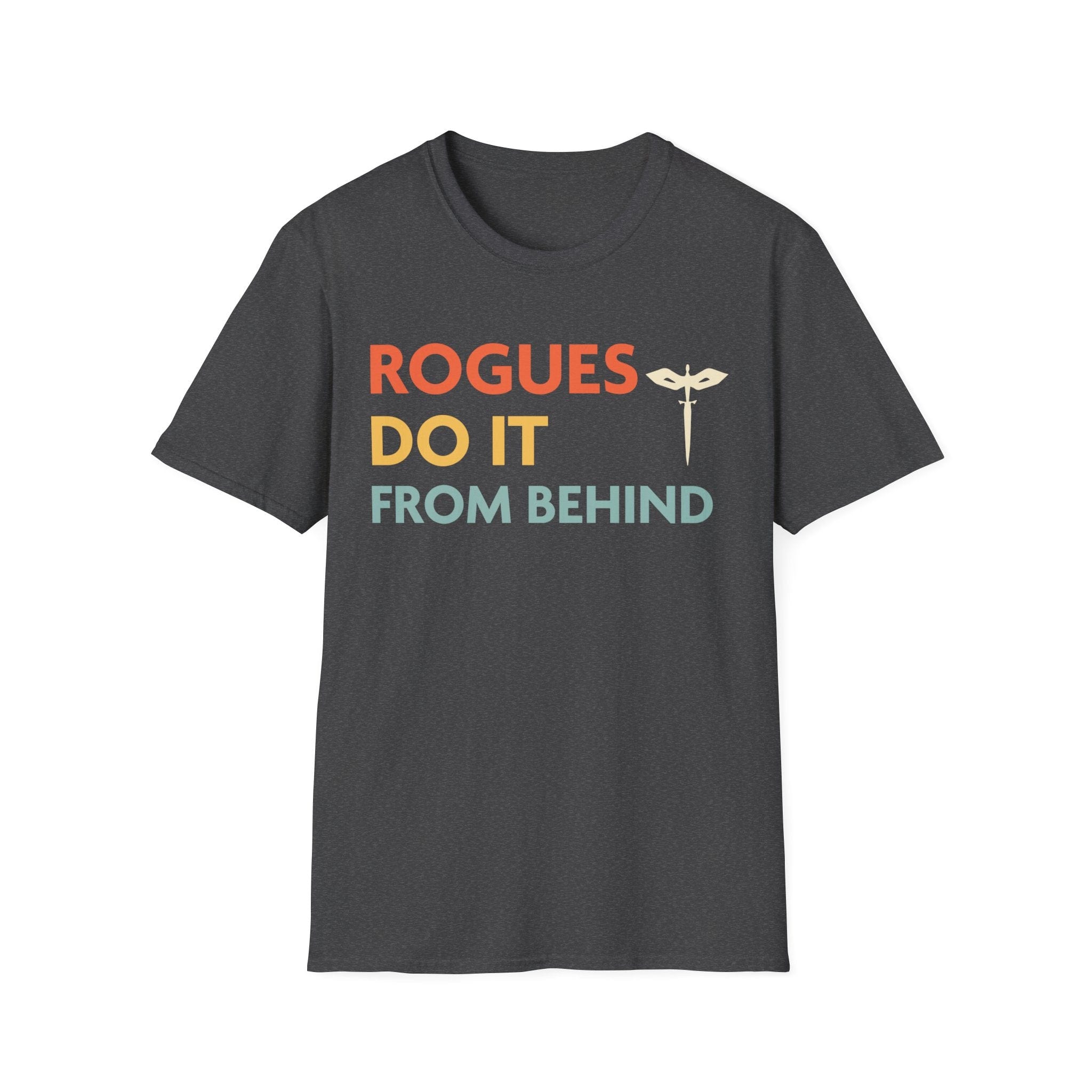 Unleash your inner adventurer with our 'Rogues Do It From Behind' t-shirt! Embrace your role, express your style, and let the world know just how your favorite class gets things done in the realm of fantasy! This fun D&D rogue class shirt is sure to be a hit on game night.