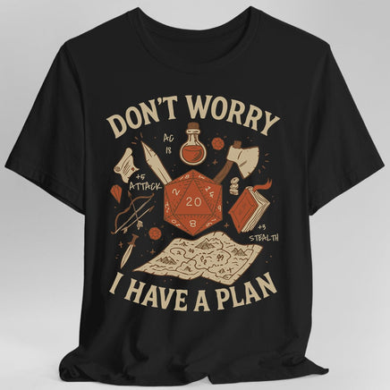Trust me, I’ve got this... probably. The “Don’t Worry, I Have a Plan” tee is perfect for chaotic strategists, dice goblins, and party members who totally thought things through. Featuring a bold d20 surrounded by essential adventuring gear—maps, weapons, potions, and that one suspiciously helpful book—this design captures the heart of every tabletop RPG night. Printed on a soft, comfy shirt that’s ready for your next campaign, con, or critical fail in the kitchen. Great for players, DMs, and anyone whose plan starts with “hear me out…”