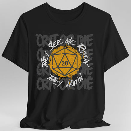 Take your streetwear style to the next level with this quirky d20 t-shirt. With the iconic phrase "they see me rollin' they hatin'" emblazoned on the front, you'll definitely make a statement. Roll on, dice enthusiasts!