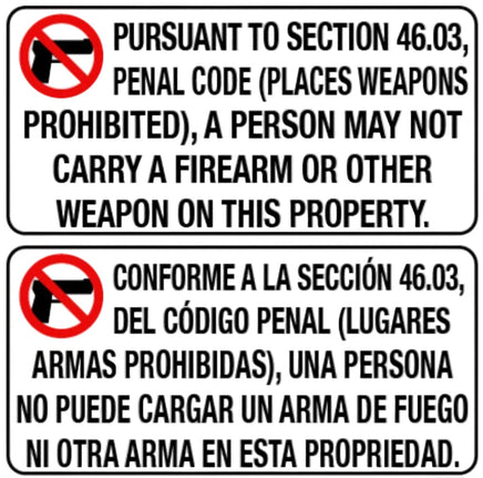 Places Weapons Prohibited 46.03 Signs 18"x18"