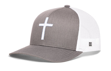 Rep the Christian life in style with the HAKA Cross Trucker Hat, featuring a premium bold cross 3D embroidery on our gray-white signature 5.0 trucker.