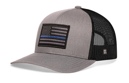 Support law enforcement in style with the HAKA Thin Blue Line Trucker Hat, featuring a premium police tactical embroidered patch on our gray-black signature 5.0 trucker.