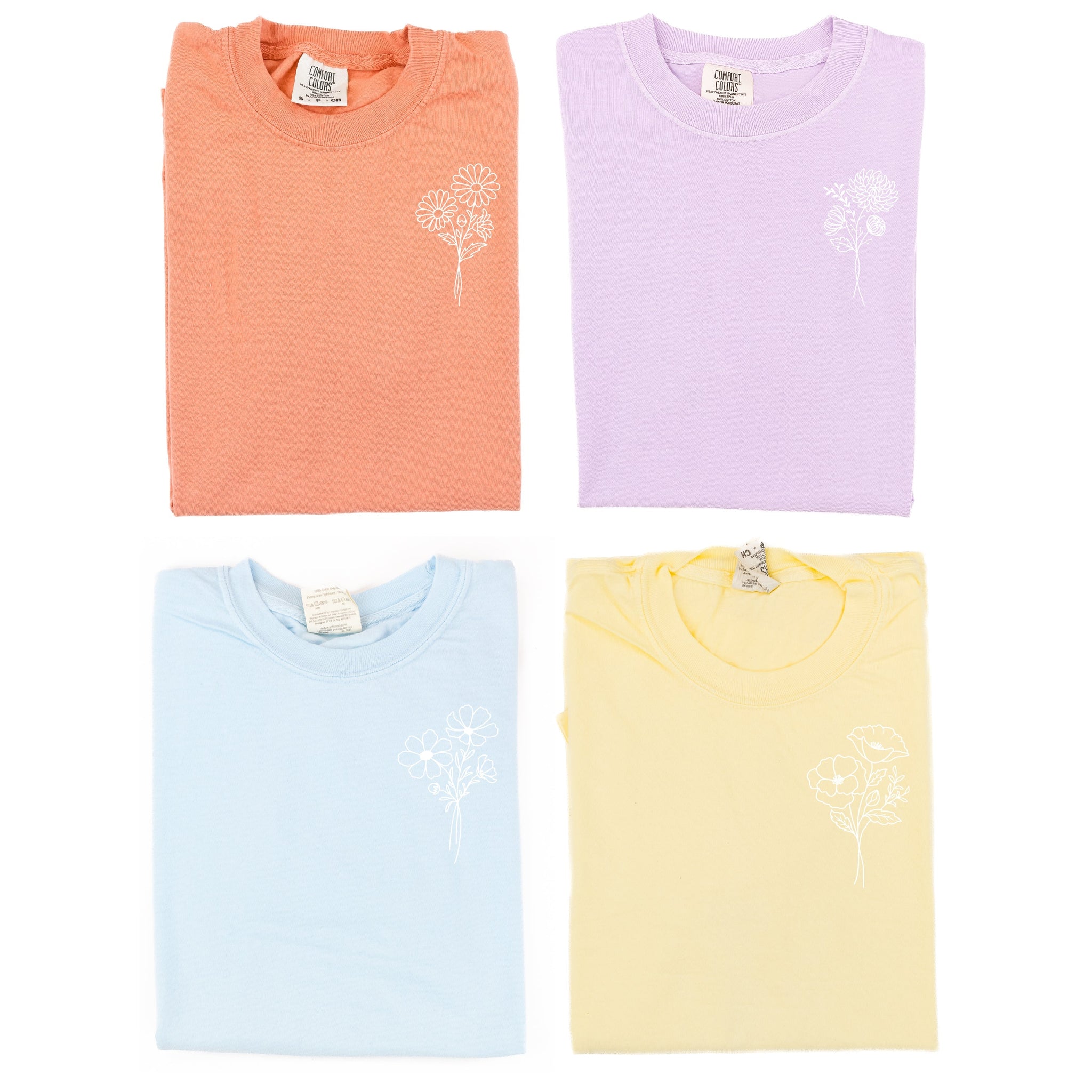 Please allow up to 7 extra days processing time for birth flower pieces. Each one is embroidered by our team of talented mothers at our warehouse in Idaho. Each piece is unique and may vary slightly in flower placement and angle.