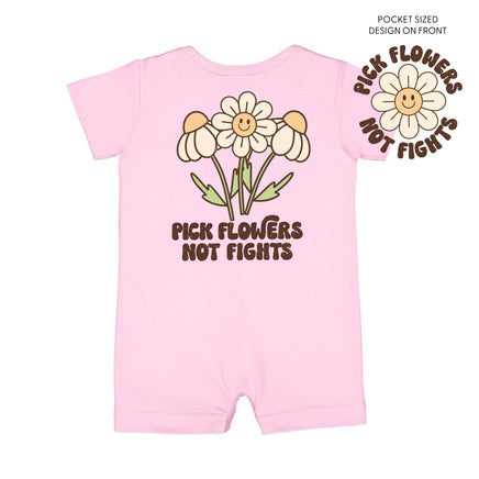 Pick Flowers Not Fights w/pocket on front- Short Sleeve / Shorts - One Piece Baby Romper