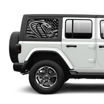 The design features the iconic stars and stripes of the American flag, skillfully intertwined with the sleek, menacing silhouette of a cobra, ready to strike. Crafted from premium, weather-resistant vinyl, these graphics are built to withstand the elements while maintaining their sharp, vibrant detail. Perfectly sized for rear side windows, they give your Jeep a dynamic, aggressive edge that’s sure to turn heads, whether you're navigating city streets or tearing up the trails.