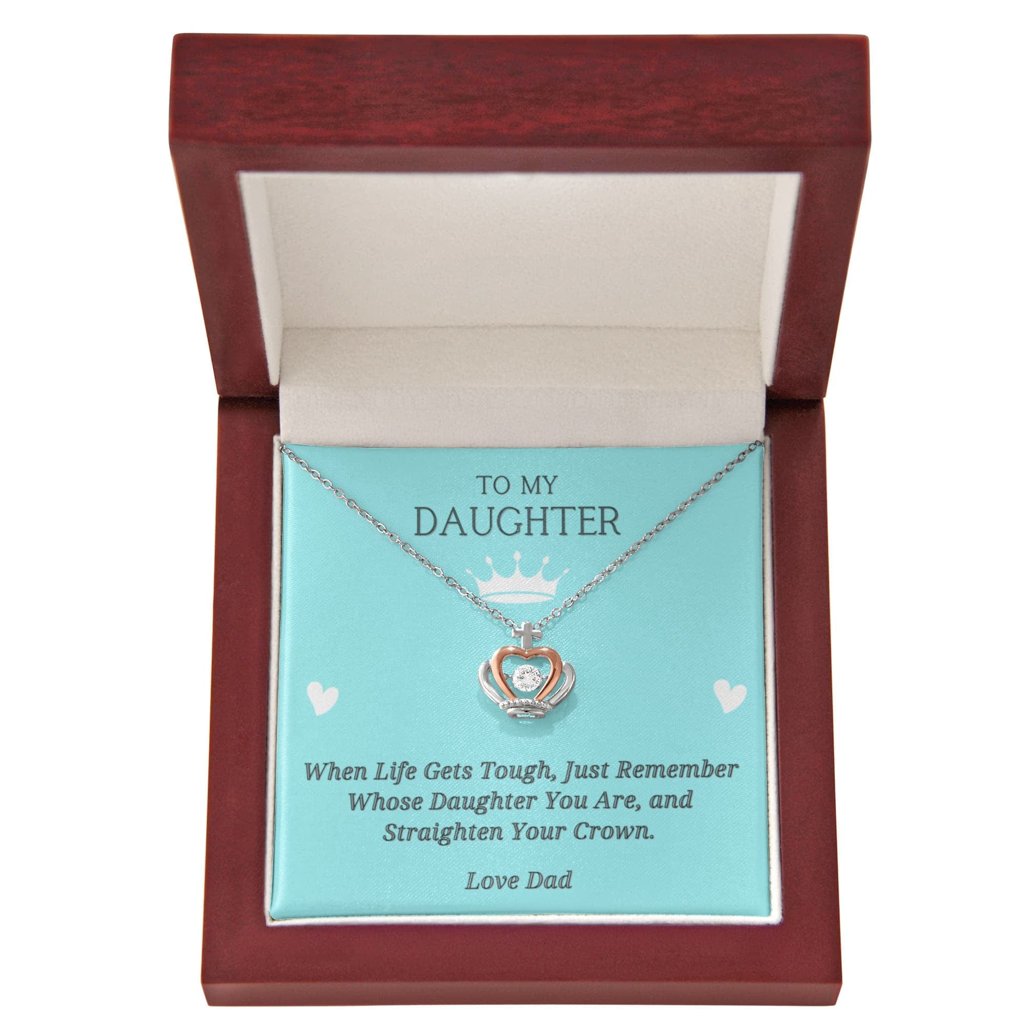 Imagine her reaction receiving this stunning Custom Crown Pendant Necklace.  Personalize with your relationship to your recipient (Dad/Daughter, Mother/Daughter?, Husband/Wife, etc.)  , catching the light with every movement. The delicate blend of silver and rose Designed to resemble a regal crown, this exquisite piece features a dazzling cubic zirconia crystal at its centergold tones adds a touch of timeless beauty, making it the perfect gift for someone who reigns over your heart.