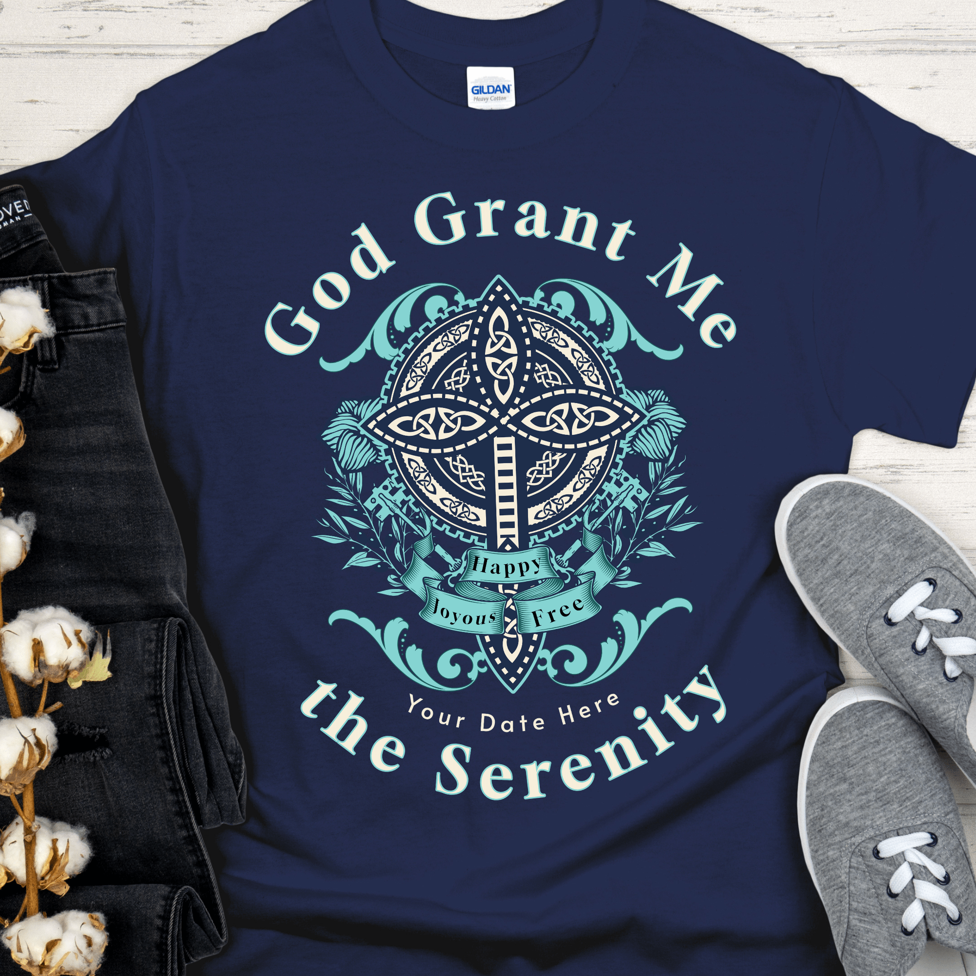 Show your support for sobriety and recovery with this inspirational T-shirt personalized with your recovery date. Featuring a bold design with nods to the Serenity Prayer and Alcoholics/Narcotics Anonymous, this is a great way to show your dedication and commitment to staying sober.